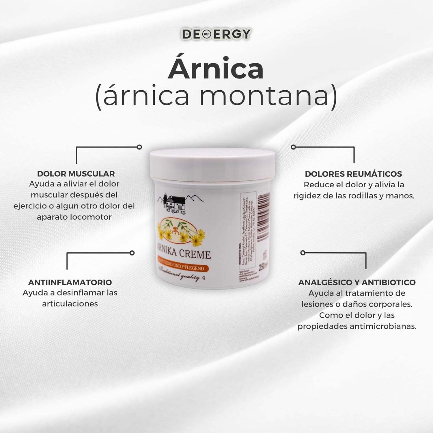 ¿Dolores musculares, articulaciones inflamadas o piernas cansadas? Con la Crema Arnica DEMERGY®, dile adiós a las molestias y disfruta de una vida más activa y sin dolor. Esta potente crema antiinflamatoria de fórmula mejorada y producto original alemán está diseñada para aliviar rápidamente el dolor muscular y articular, proporcionando un efecto calmante y reparador.