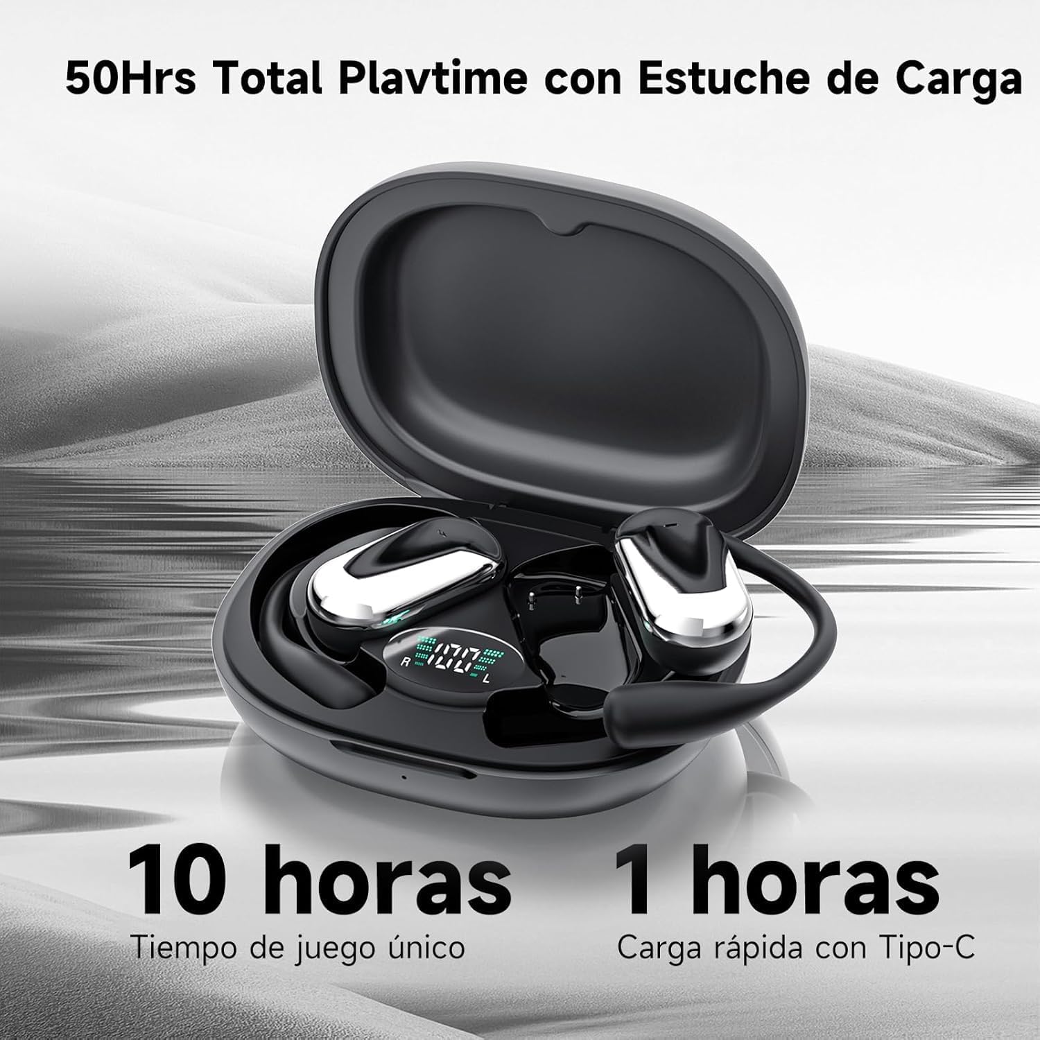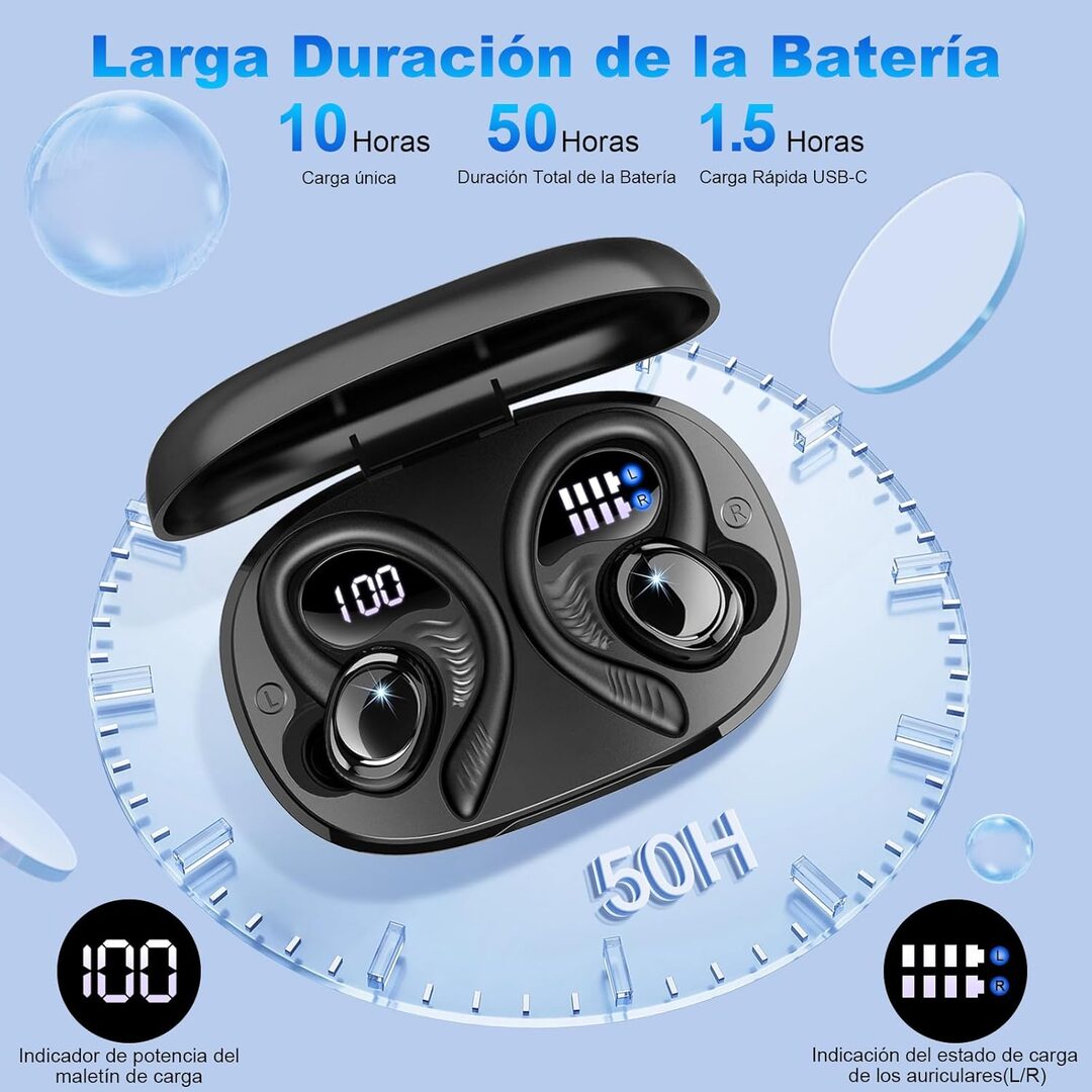 Hasta 75 horas de reproducción: Con 15 horas de uso continuo con una sola carga, más 5 recargas completas con el estuche de carga de 650 mAh, estos auriculares te ofrecen un total de 75 horas de reproducción. ¡Perfectos para entrenamientos largos, viajes o días completos de trabajo!
