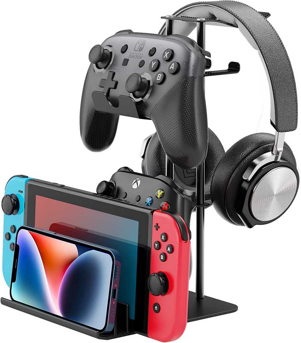 Se trata de un soporte de auriculares de colocación vertical que permite poner también 2 controles de videojuegos. El soporte está fabricado en aluminio, siendo completamente universal para poner todo tipo de auriculares en el mismo. Viene con una base de metal, con un diseño de centro de gravedad bajo para evitar que se vayan a caer o a golpear en cualquier momento. Además, el soporte tiene goma en su base para evitar que se resbale o se caiga.