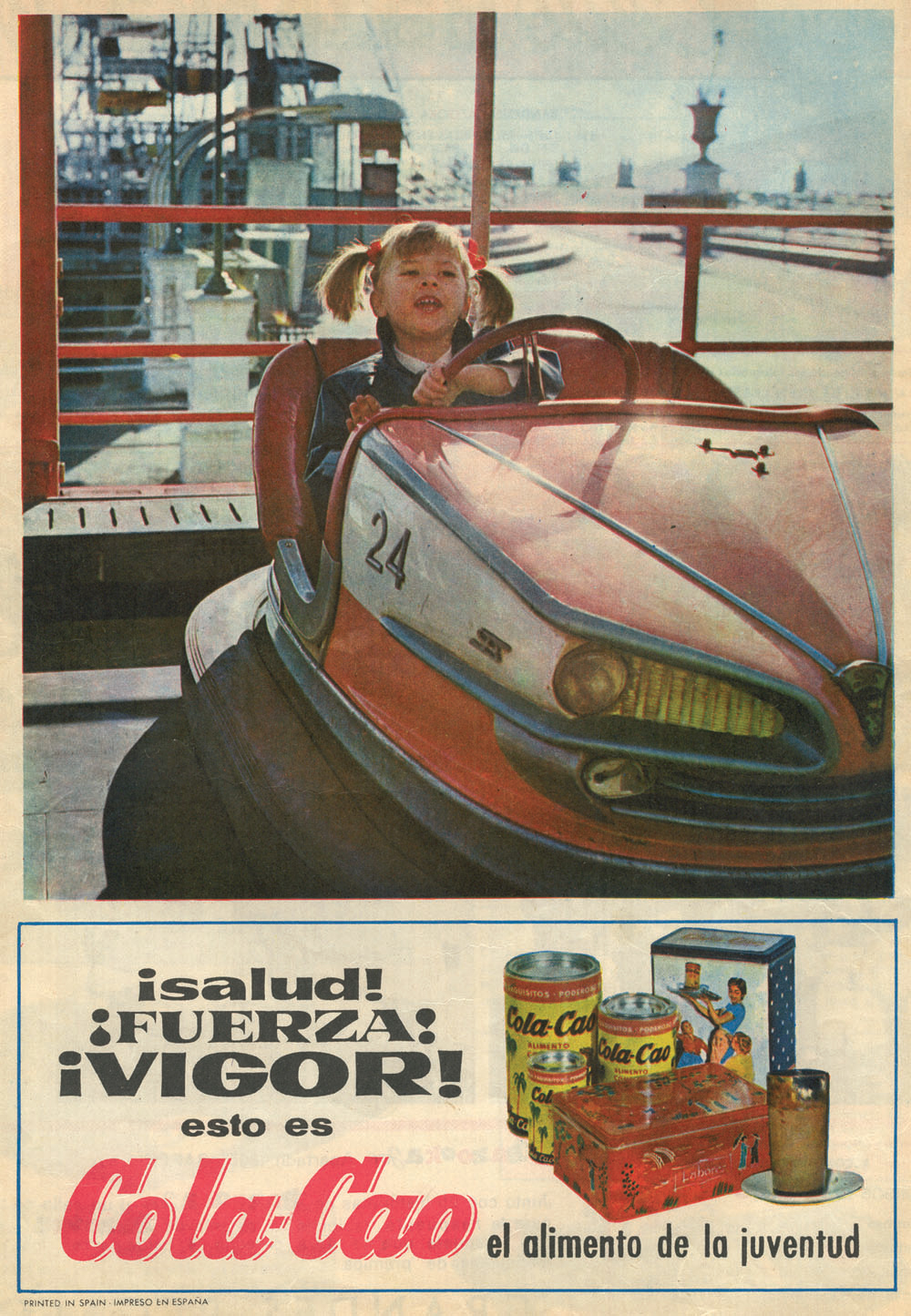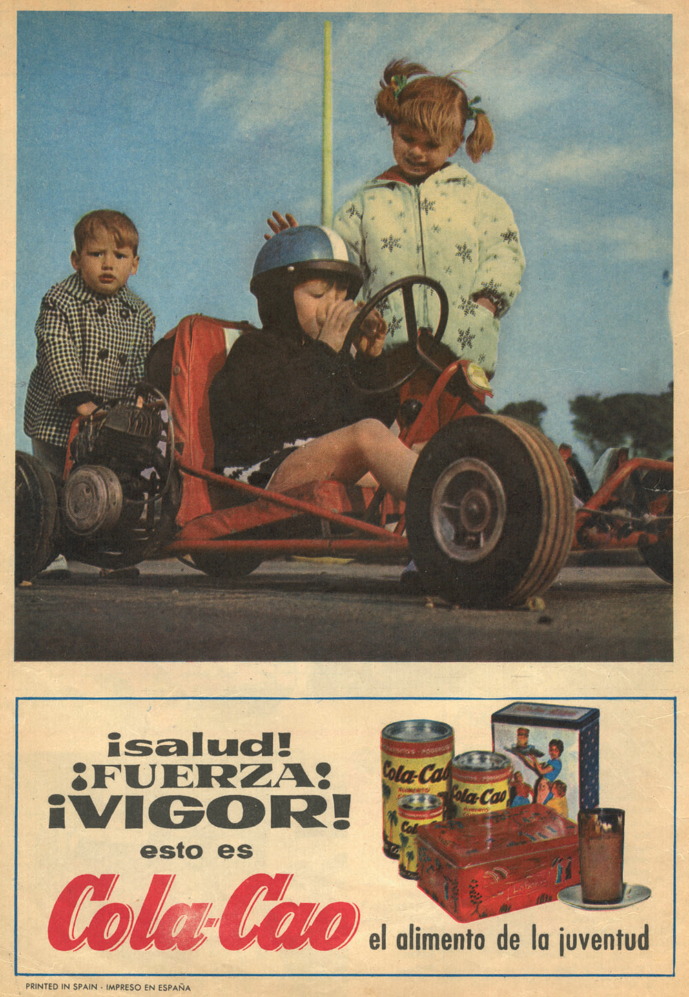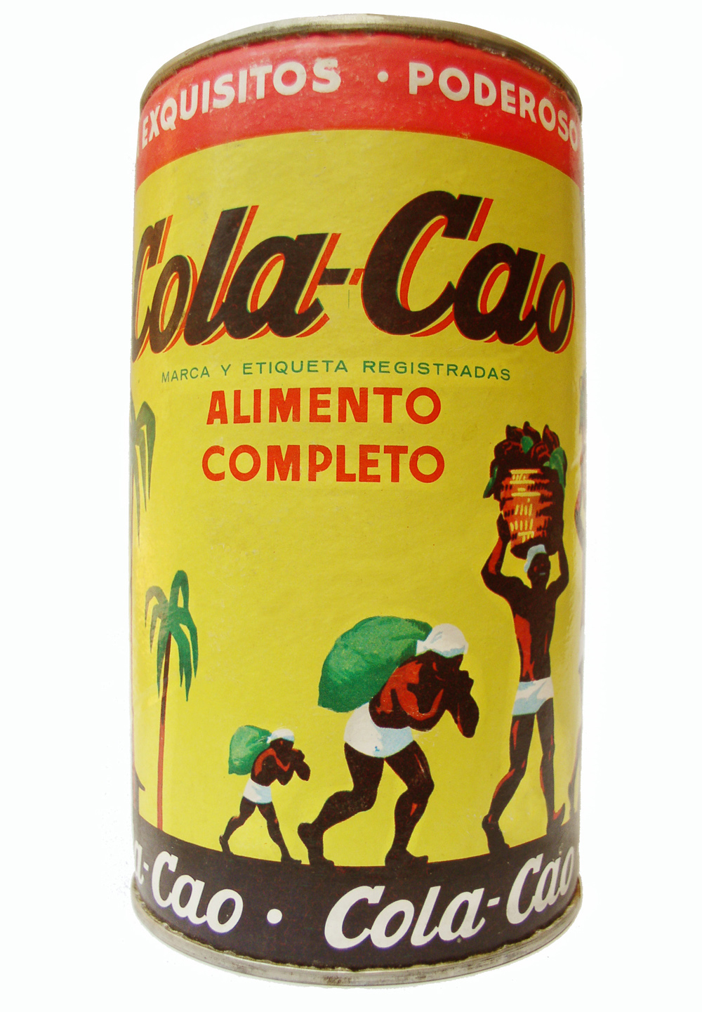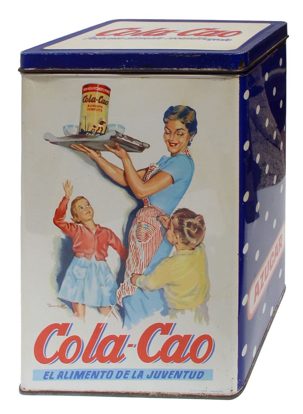 Bote de Cola-Cao, c. 1960. ¿Quién no ha visto un bote metálico de Cola-Cao para almacenar arroz, harina o garbanzos en la cocina de su madre o abuela? (c. 1965) Al verlo se dispara la nostalgia.