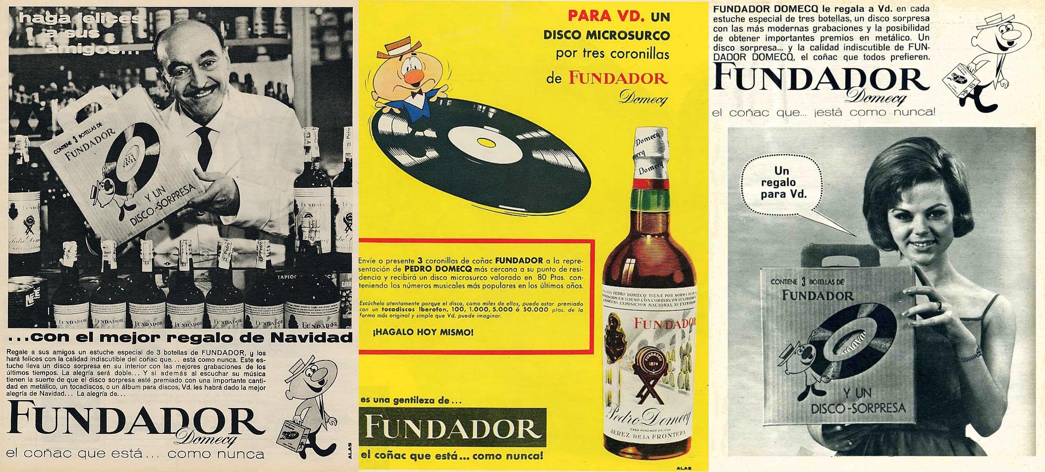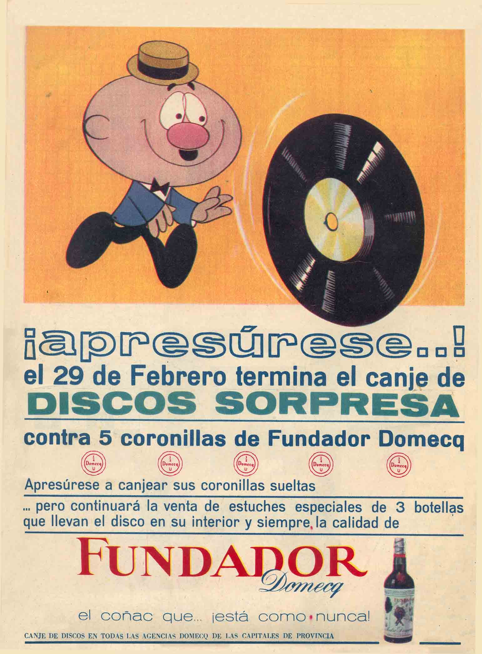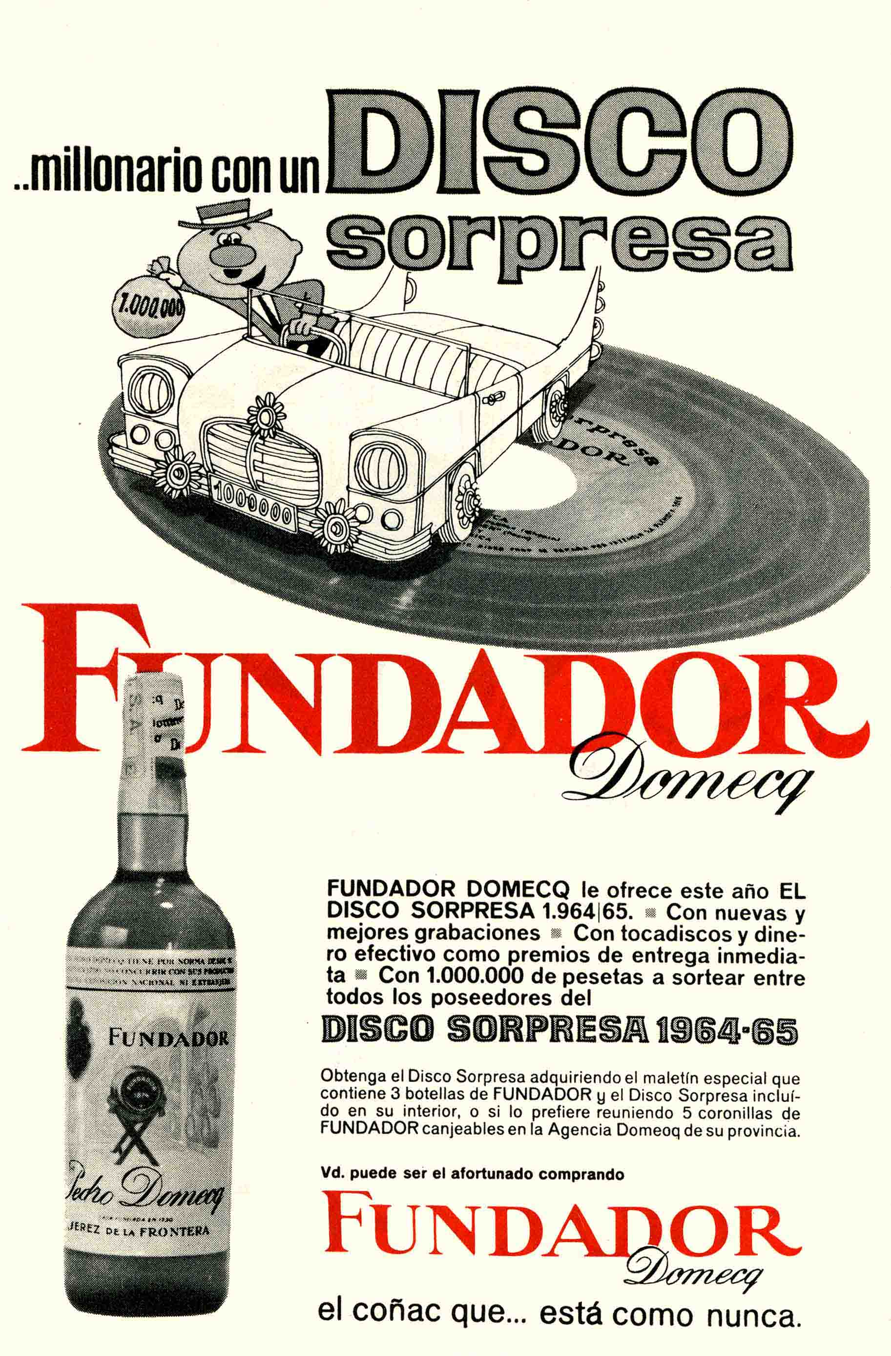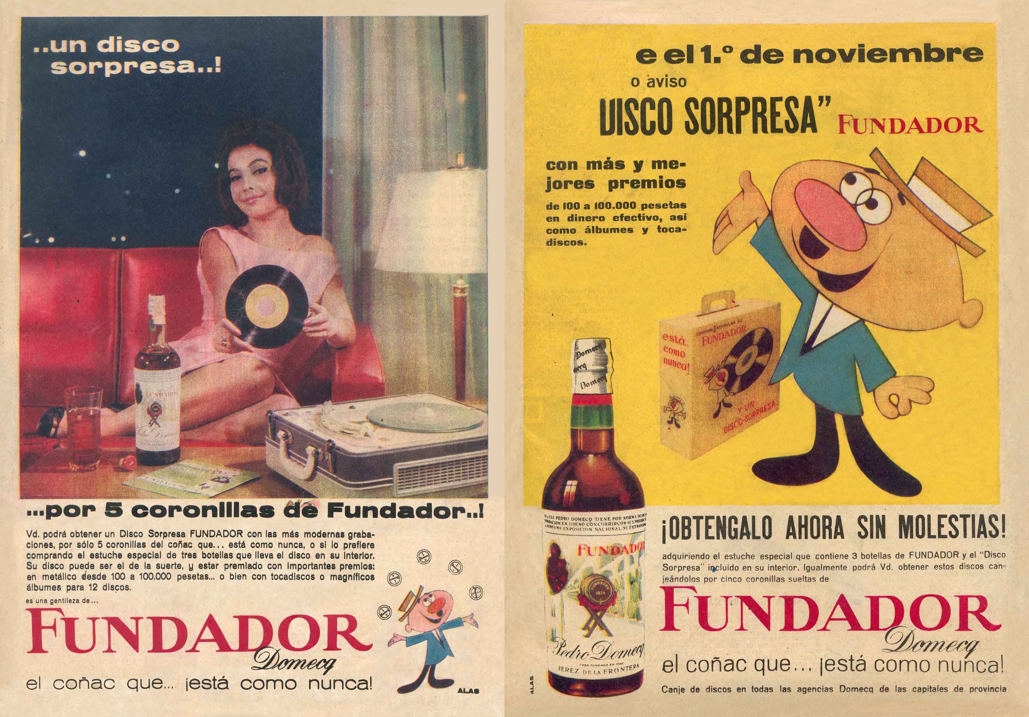 La originalidad de la campaña ideada para promocionar el coñac Fundador fue el "disco sorpresa". Se obtenía cambiando cinco coronillas de las botellas por un disco. Al final del disco se anunciaba el premio que podía ganar el consumidor.
