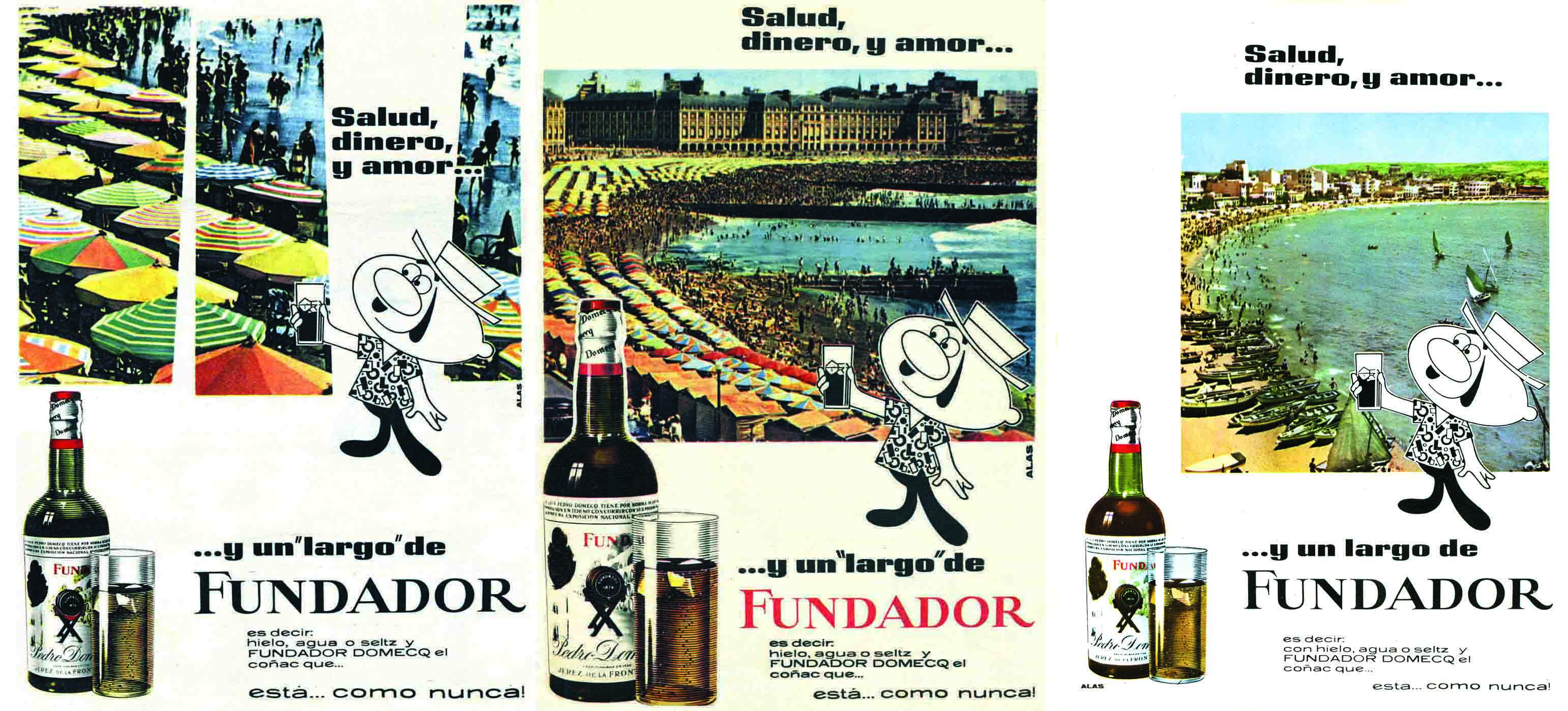 Con hielo y tumbado en una hamaca en la playa, el coñac Fundador era el compañero ideal para unas vacaciones en las costas españolas, como reflejan estos anuncios del inicio del "desarrollismo" español.