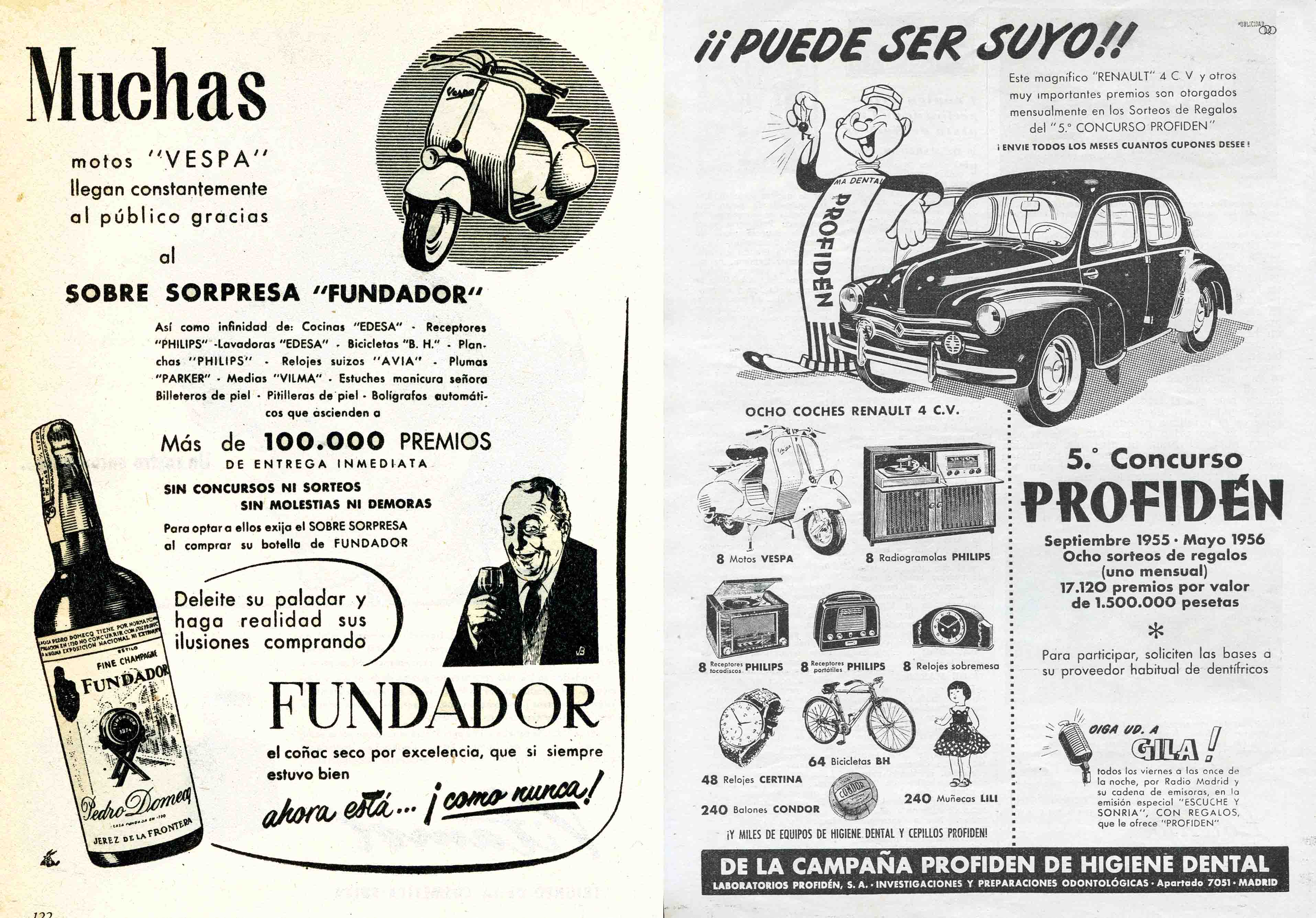 Antes del Disco Sorpresa, en 1955, Fundador entregaba un sobre por la compra de una botella. La Vespa era entonces el regalo estrella, aunque otras firmas, como el dentífrico Profidén, además de vespas regalaba un Renault "4-4".