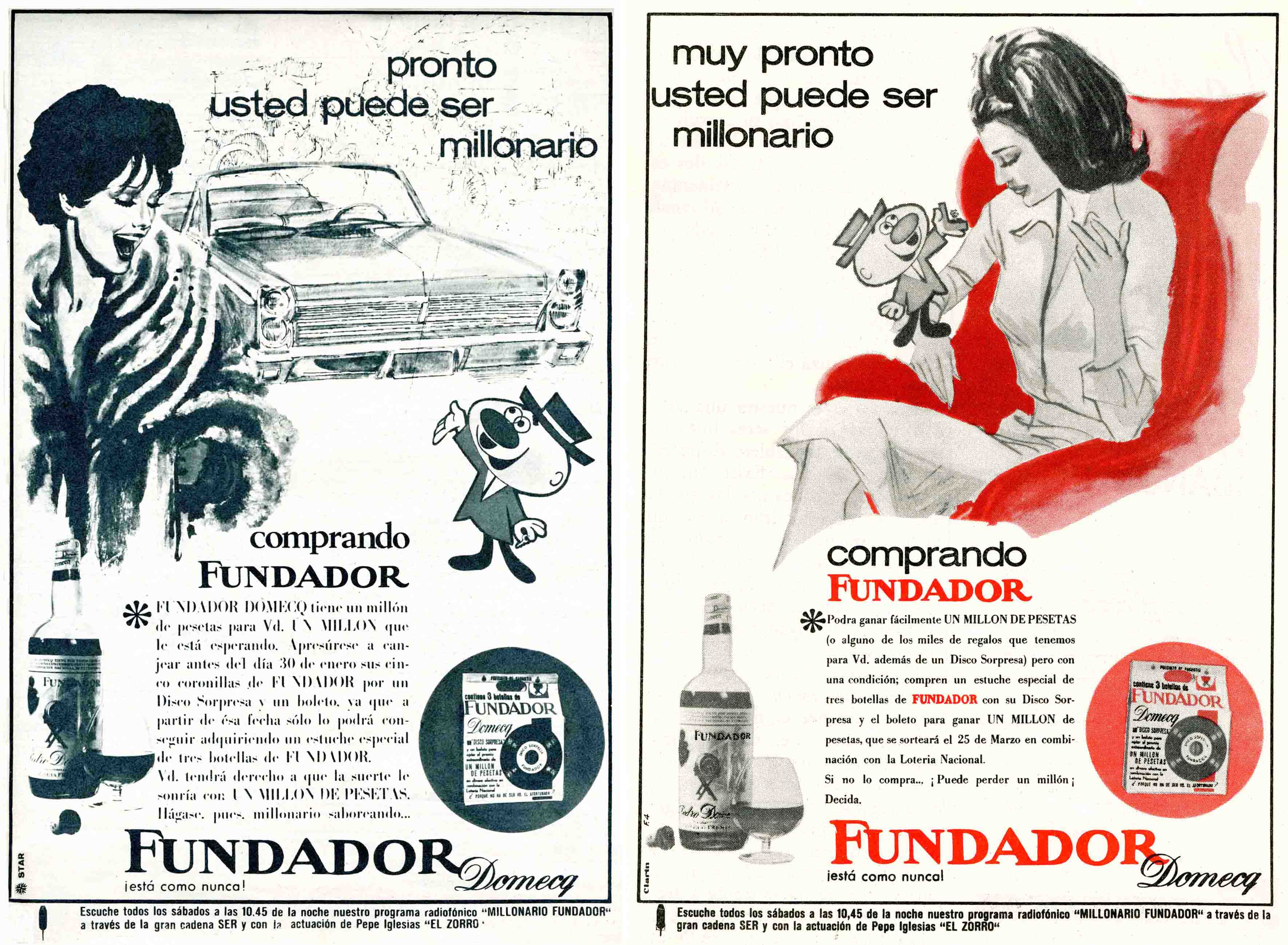 En 1965, Fundador dejó a un lado el "Disco Sorpresa" y se centró en la promoción de regalar millones en metálico. El reconocido presentador Pepe Iglesias "El zorro", en el programa "Millonario Fundador", promocionaba la marca jerezana. Don Pedrito seguía siendo su mascota, aunque su menor tamaño indicaba su declive.