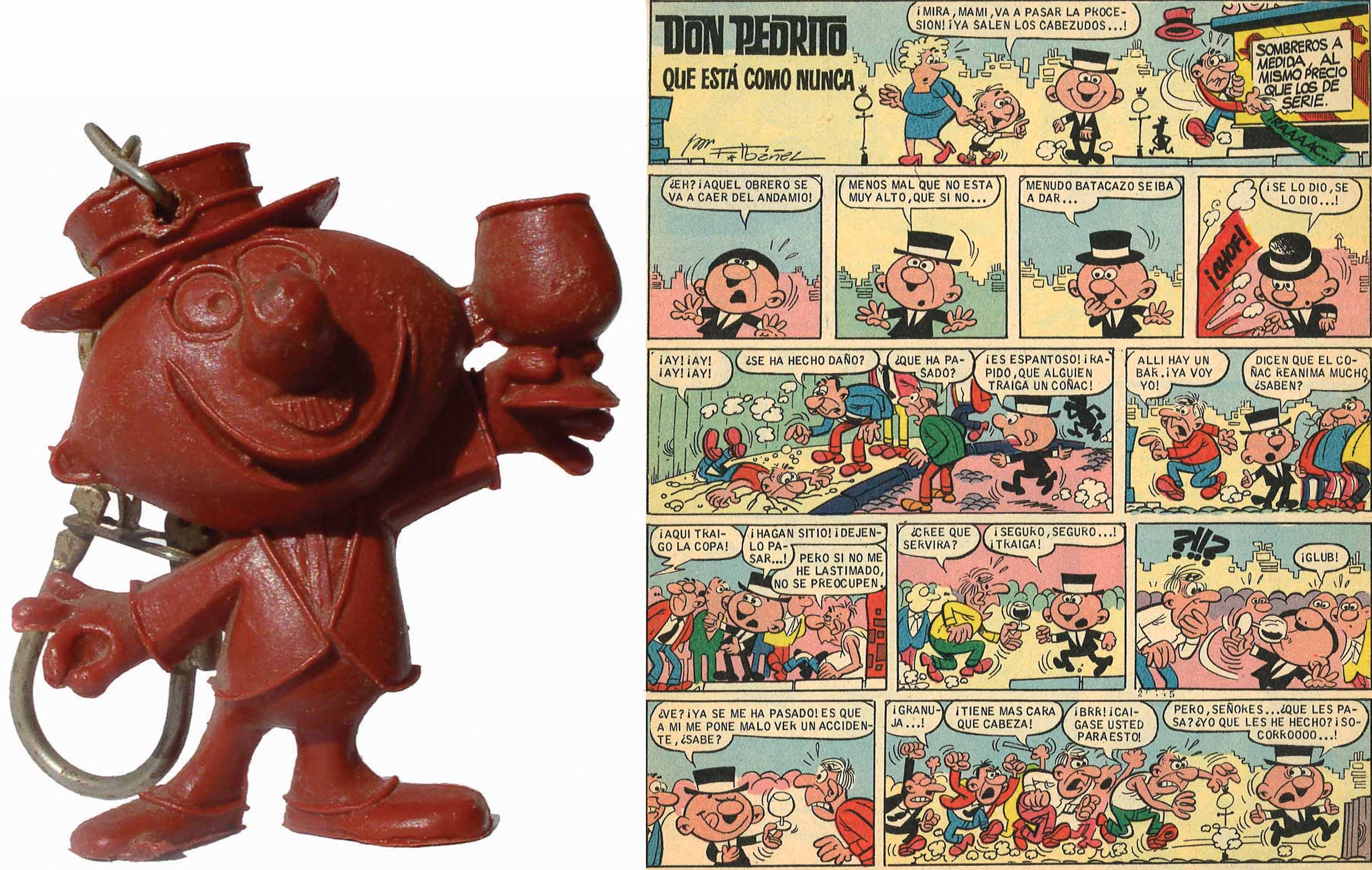 Don Pedrito tuvo su "marchandising", como este llavero con su figura toscamente realizada en plástico, discos para bailar en los guateques y sus aventuras en tebeos, "Don Pedrito, Que está como nunca", dibujados por F. Ibáñez.