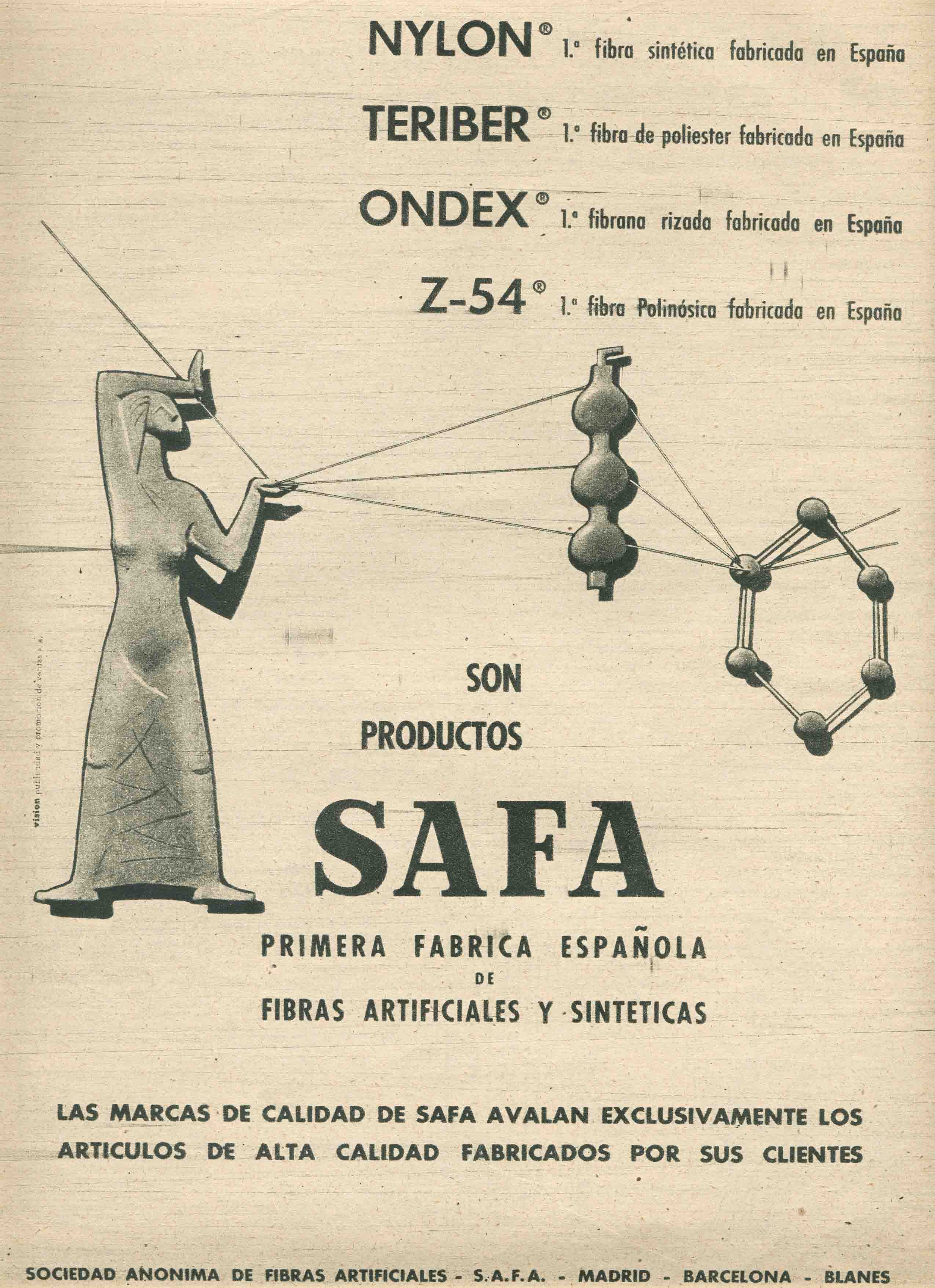 Las fibras artificiales sustituyeron a las naturales, convirtiendo las prendas en inarrugables. Ya no será necesario salir al extranjero para adquirir prendas masculinas de Tergal y otras fibras sintéticas, porque SAFA, la primera fábrica española de fibras artificiales de alta calidad fabricadas por sus clientes, las pone al servicio de todos los españoles.