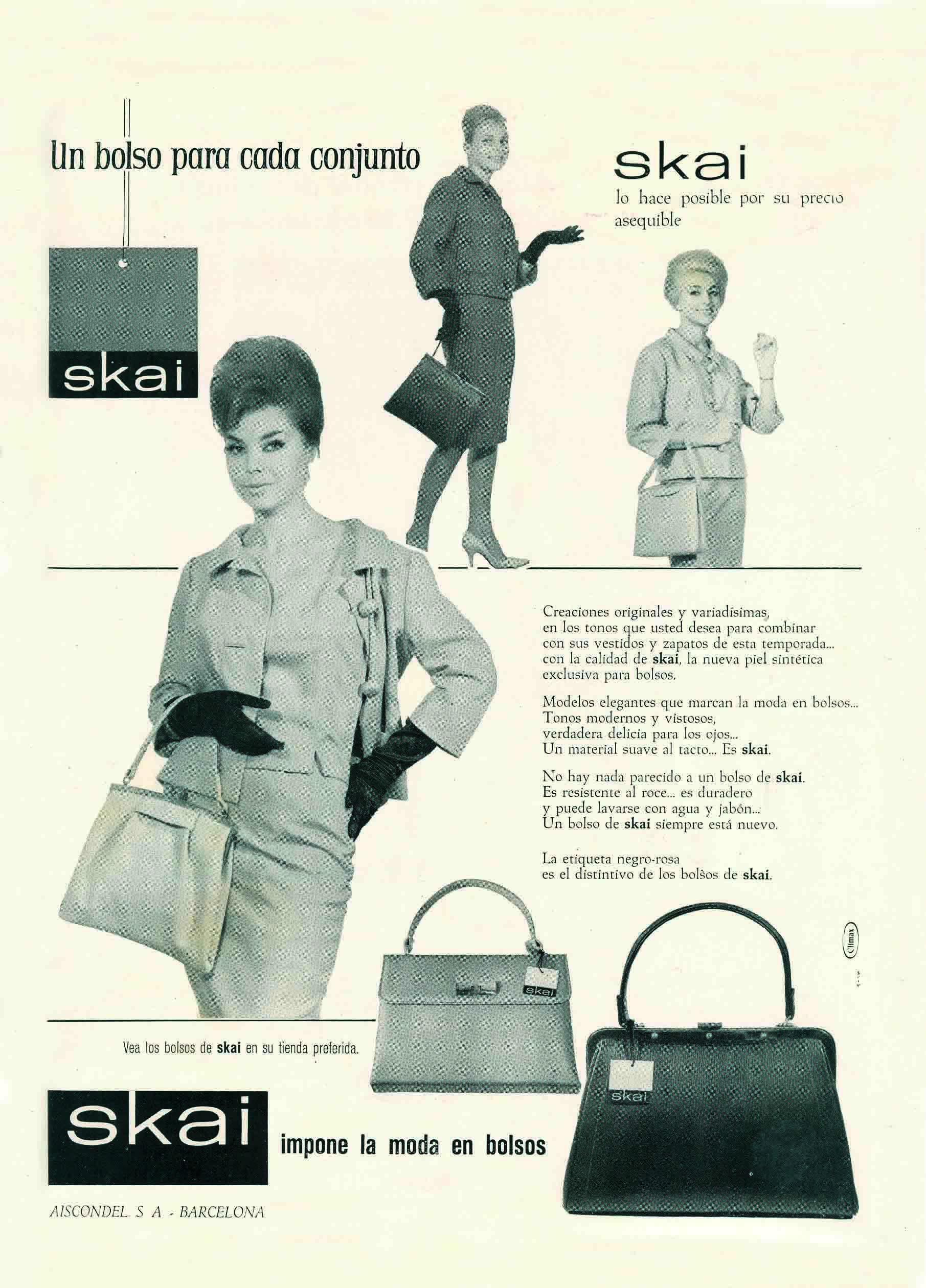 La polipiel sustituyó a la piel natural en tapicerías de sofás, asientos de coches, trajes y bolsos de señora como estos del anuncio de la marca Skai. La polipiel abarató los sofás de cuero y los asientos de los coches, pero en verano se pegaban al cuerpo como un chicle.