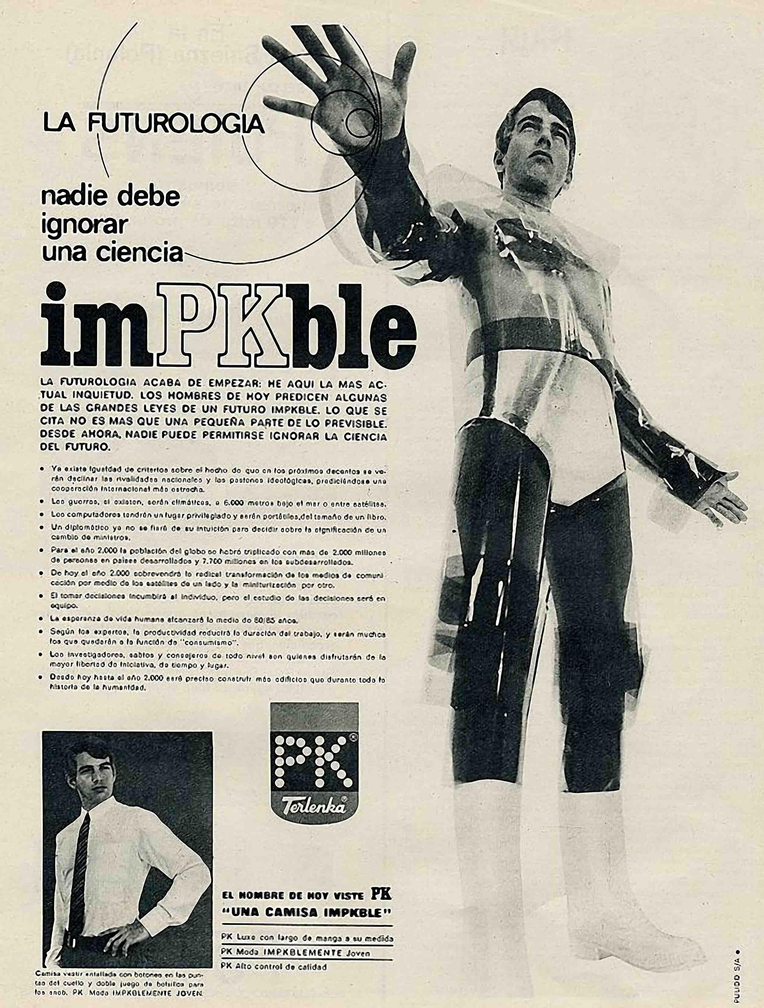 Anuncio futurista para promocionar las camisas PK, con un eslogan imPKable. Hoy, un anuncio así daría miedo.