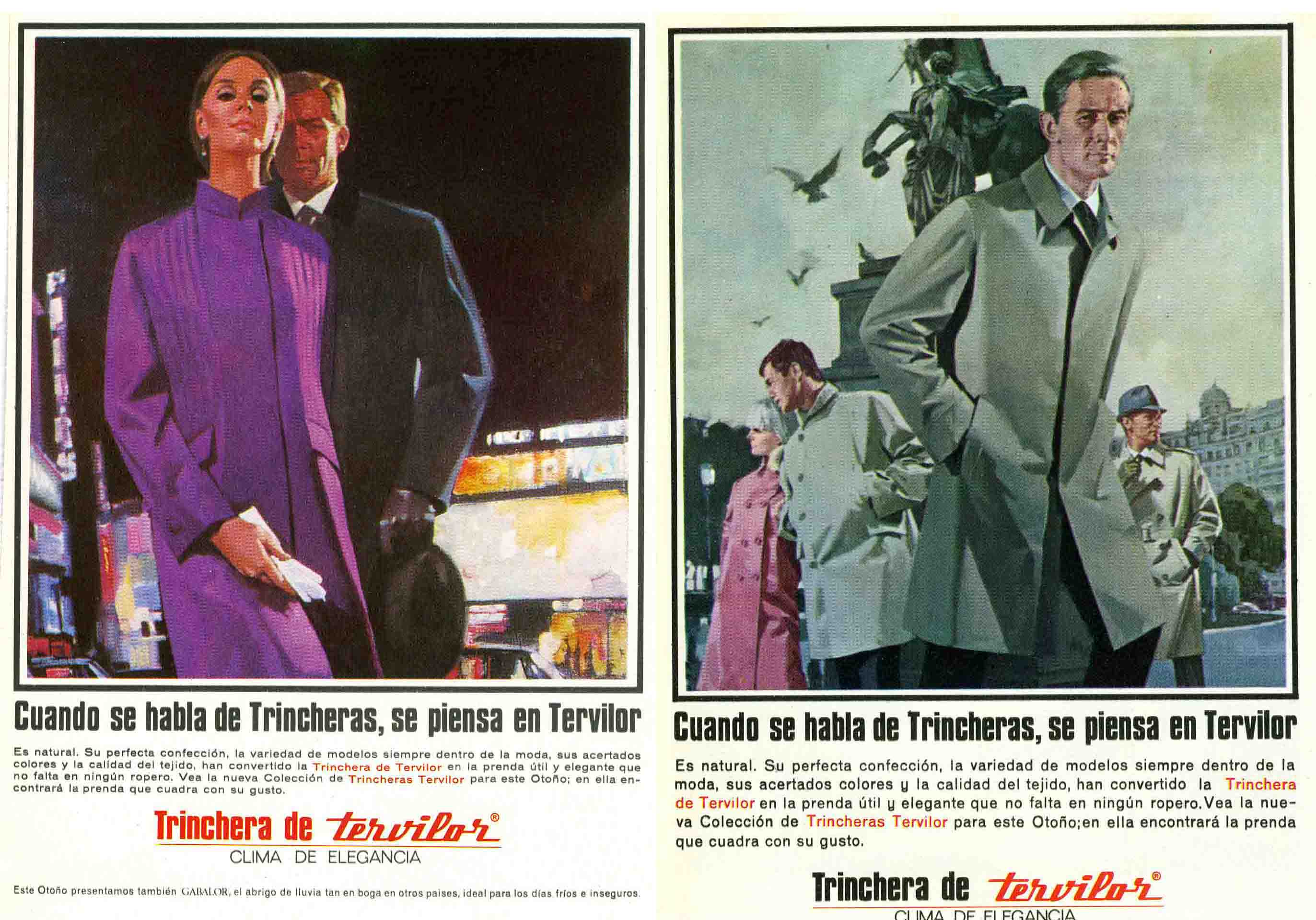 A los impermeables de fibra sintética le siguieron las camisas y pantalones inarrugables. Cada vez un número mayor de prendas de vestir utilizaban la mezcla de algodón con un alto porcentaje de poliéster, como esta trencas de Tervilor.