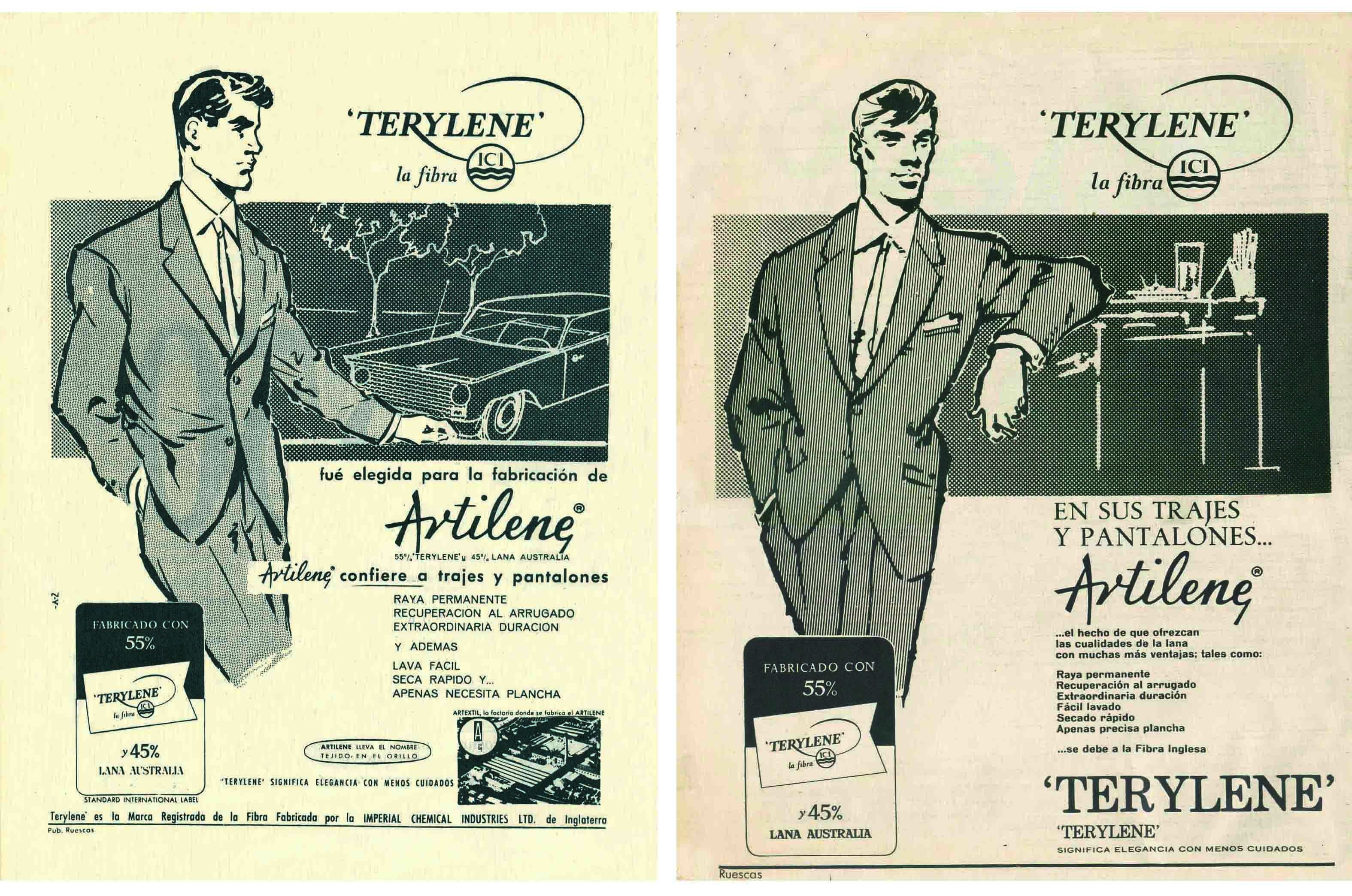 Terylene, al igual que el Artilene, era una patente inglesa que fabricaba Imperial Chemical Industries. La composición era 55% de fibra sintética y un 45% de lana australiana.