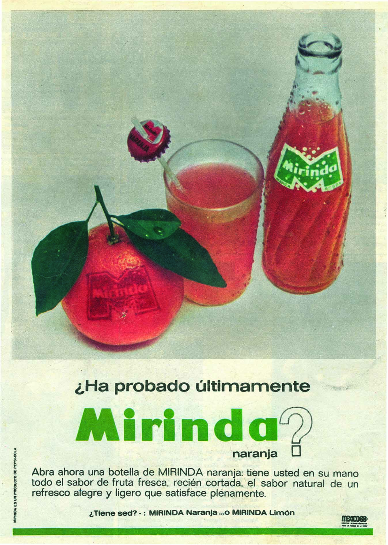 Las bebidas refrescantes de naranja entablaron una dura competencia en los bares y discotecas a medida que avanzaban los años 60 y los españoles tenían mayor poder adquisitivo. La campaña de Mirinda, el refresco español comprado por Pepsi-Cola en 1970, con los discos regalo de cantantes pop, fue muy celebrada, justo cuando los discos de cuatro canciones desaparecían del mercado.