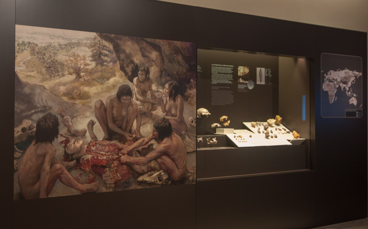 La zona dedicada a la prehistoria está decorada con ilustraciones que muestran aspectos de la vida de los hombres prehistóricos, como esta que reproduce los ejemplos de canibalismo en Atapuerca
