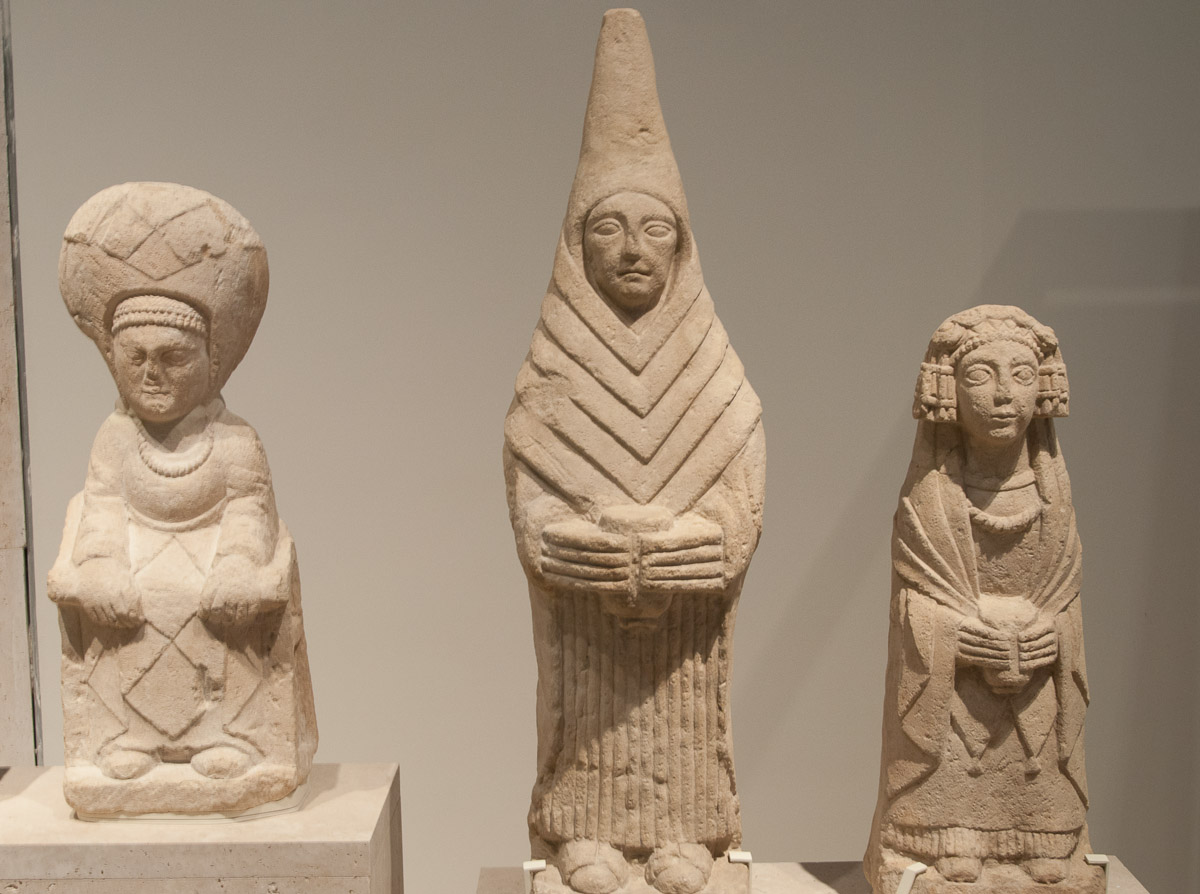 Las esculturas íberas de damas oferentes tienen elementos comunes, pero también pueden ser muy diferentes, como estos tres ejemplos en la imagen. La del centro, encontrada también el Cerro de los Santos, tiene una estética muy particular