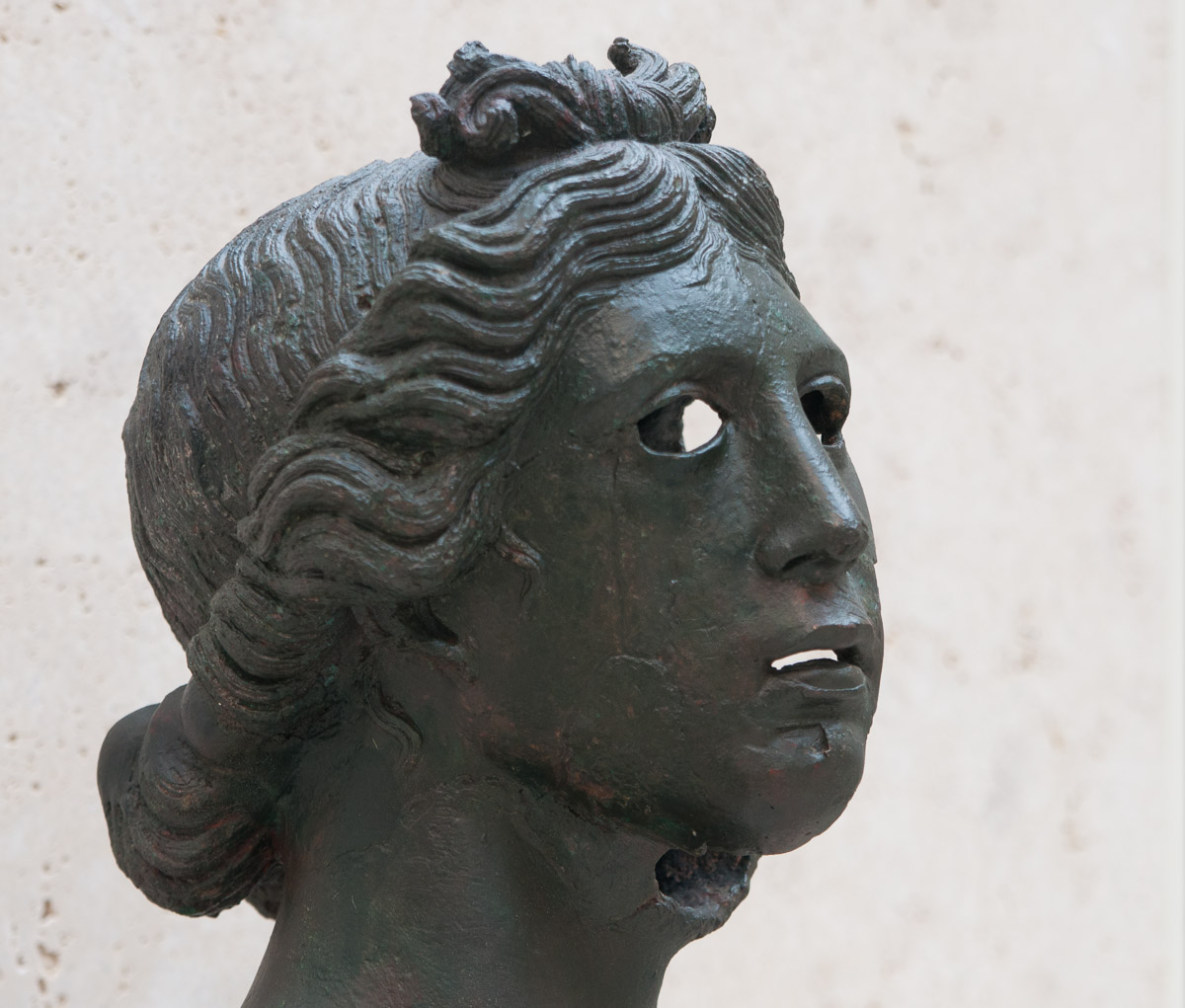 La cara de una escultura en bronce del patio de esculturas romanas