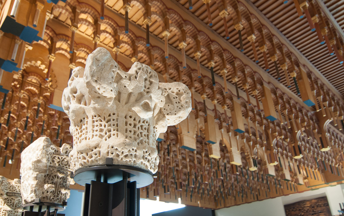 Una curiosa maqueta de la mezquita de Córdoba colgada del techo nos ofrece una perspectiva inédita y sorprendente del edificio. Junto a ella podemos contemplar también alguno de los capiteles originales