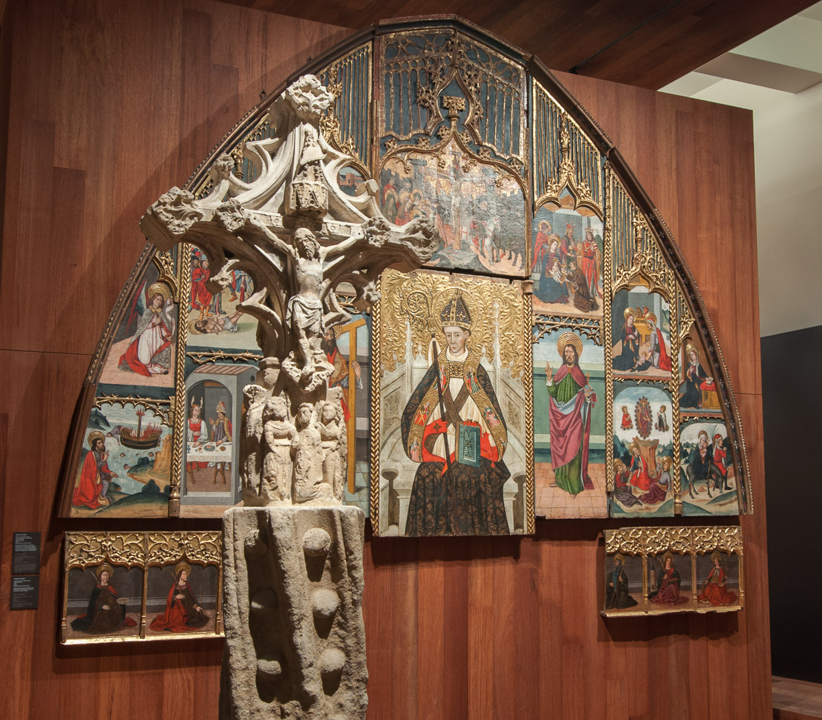 Una recargada cruz de piedra y el impresionante Retablo de San Martín de Tours, pintado en los siglos XV y XVI