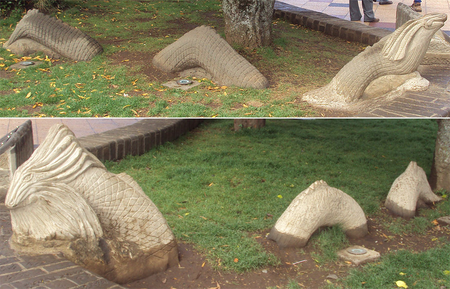 El enfrentamiento entre dos seres mitológicos con forma de serpiente, Trentren Vilu y Caicai Vilu, produce en la mitología mapuche la devastación y las inundaciones, después de que la segunda se indignase por el escaso agradecimiento de los hombres por todo lo que recibían del mar. La victoria tras una larga lucha fue para Trentren Vilu, protector de los hombres, pero no logró retornar la tierra a su estado primitivo. En la imagen, estatuas de Trentren y Caicai en Chiloé