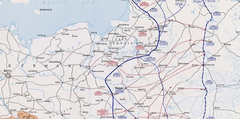 Conscientes de que durante las primeras semanas encontrarían en Prusia Oriental tan sólo una pequeña fuerza desplegada a la defensiva y que el grueso del ejército austriaco se dirigiría contra Serbia si conseguía aparentar una actitud ambigua durante unos días, el alto mando ruso, en un exceso de confianza, tomó la peor de las decisiones posibles, esto es, atacar en los dos frentes a la vez. Por si fuera poco, la ofensiva en Prusia Oriental, con sus poderosos 1º y 2º Ejércitos, se planeó en la peor forma, dividiendo las fuerzas para que cada uno atacara desde lugares diferentes. Al 8º Ejército alemán, que tenía encomendada la defensa del territorio, le bastó dirigirse primero contra el 2º ruso, que estaba en el sur, derrotarlo tras envolverlo en una enorme bolsa en lo que fue la famosa batalla de Tannenberg y luego enfrentarse al 1º para también vencerlo. Cuando llegaron los refuerzos del frente occidental enviados por el medroso Moltke todo había terminado.