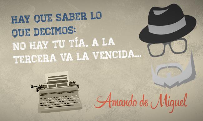 -A la tercera va la vencida. Se aplica a la situación en la que la tercera vez que se intenta algo es la definitiva, la que consigue el objetivo deseado. Existen varias interpretaciones sobre su origen. En el Derecho Penal tradicional se imponía la pena de muerte al ter furtum, al hurto por tercera vez. Cabe el origen bíblico del gallo que cantó tres veces. La definitiva fue la decisiva negación de Pedro. Más sencilla es la explicación de "un, dos, tres" que se sigue en ciertos juegos infantiles o deportivos.