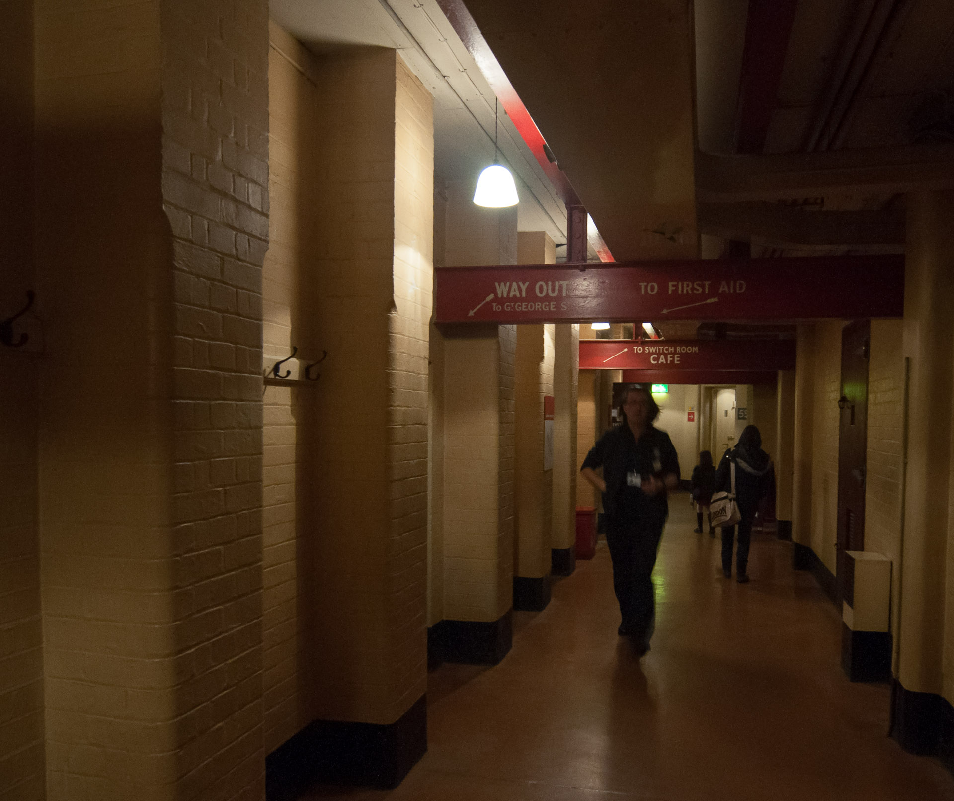 Los largos pasillos de ladrillo pobremente iluminados no son la parte más espectacular de la exposición pero sí resultan útiles para que el visitarte se vaya sumergiendo en el ambiente del búnker