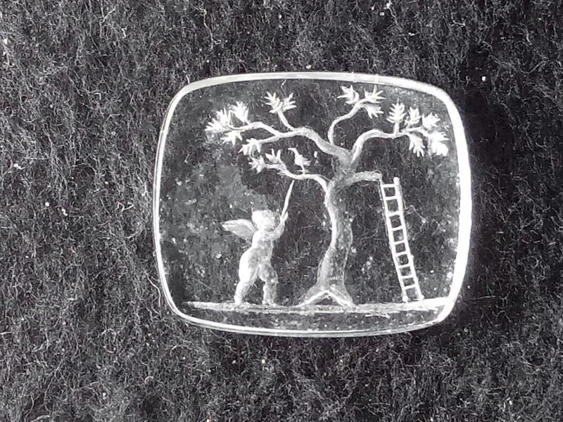 La delegada territorial de Educación, Cultura y Deporte, Yolanda Caballero, que se trata de un muestra excelente de la joyería de los siglos I y II. "Pese a ser una pieza muy pequeña, podemos apreciar como en el cristal de roca hay grabado un dios alado del amor que intenta alcanzar con su vara la parte superior de un árbol y junto a él se apoyan unas escaleras en las ramas de este", ha destacado.