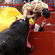 Momento en el que el diestro es corneado | EFE Miguel Ángel Perera, "muy grave" tras una espectacular cogida en Salamanca El diestro ha sido cogido por su primer toro, que literalmente lo ha sacado del ruedo, y ha tenido que ser operado de urgencia en la propia plaza.