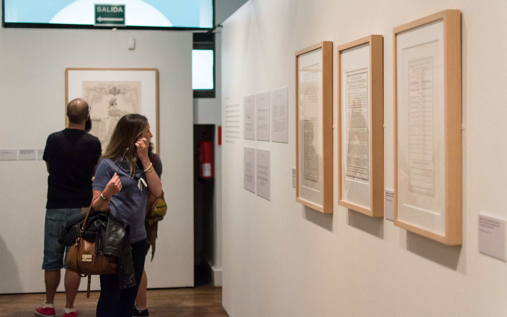 Una mujer observa una serie de herramientas de escritura en el interior de la exposición.