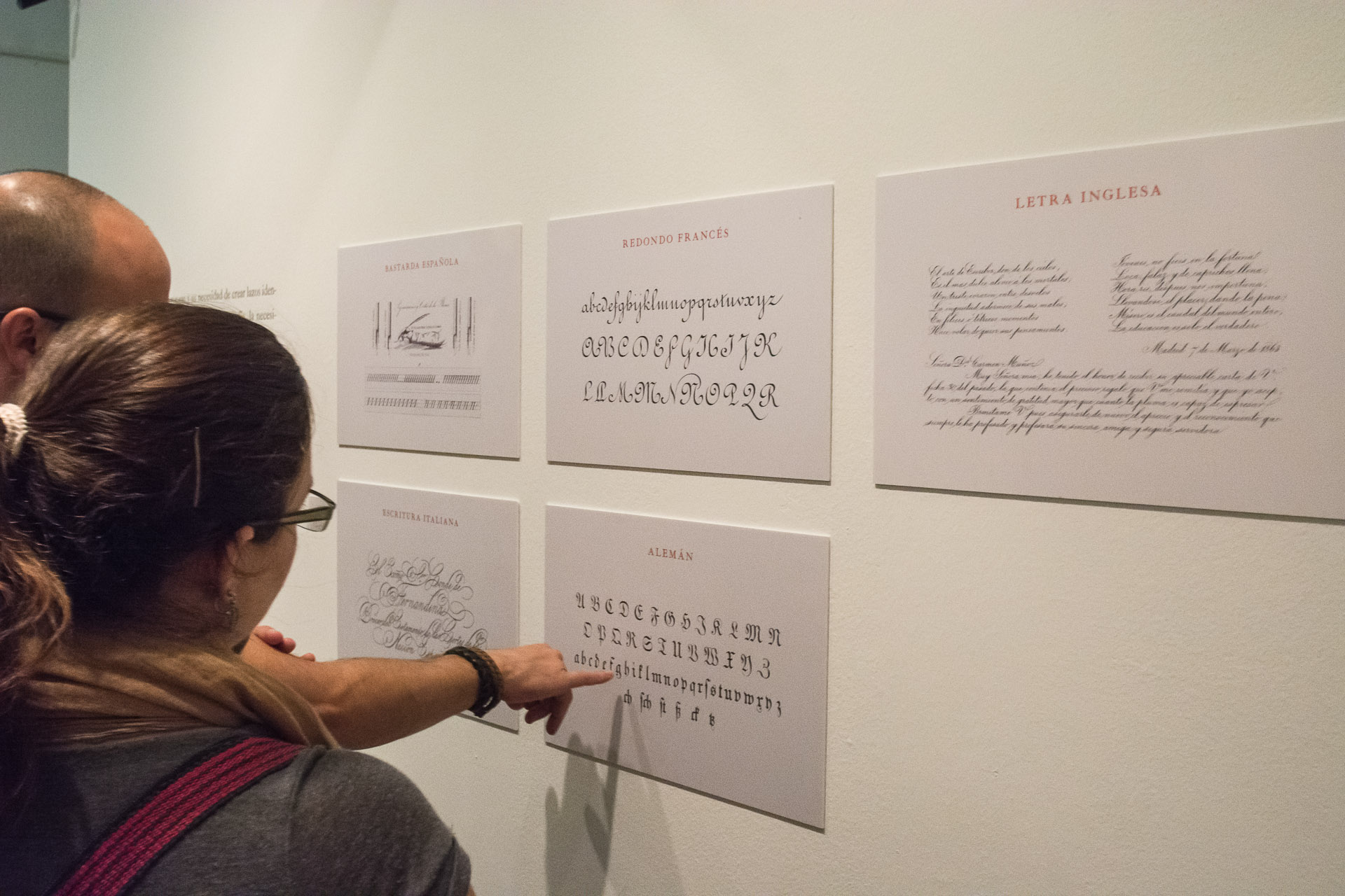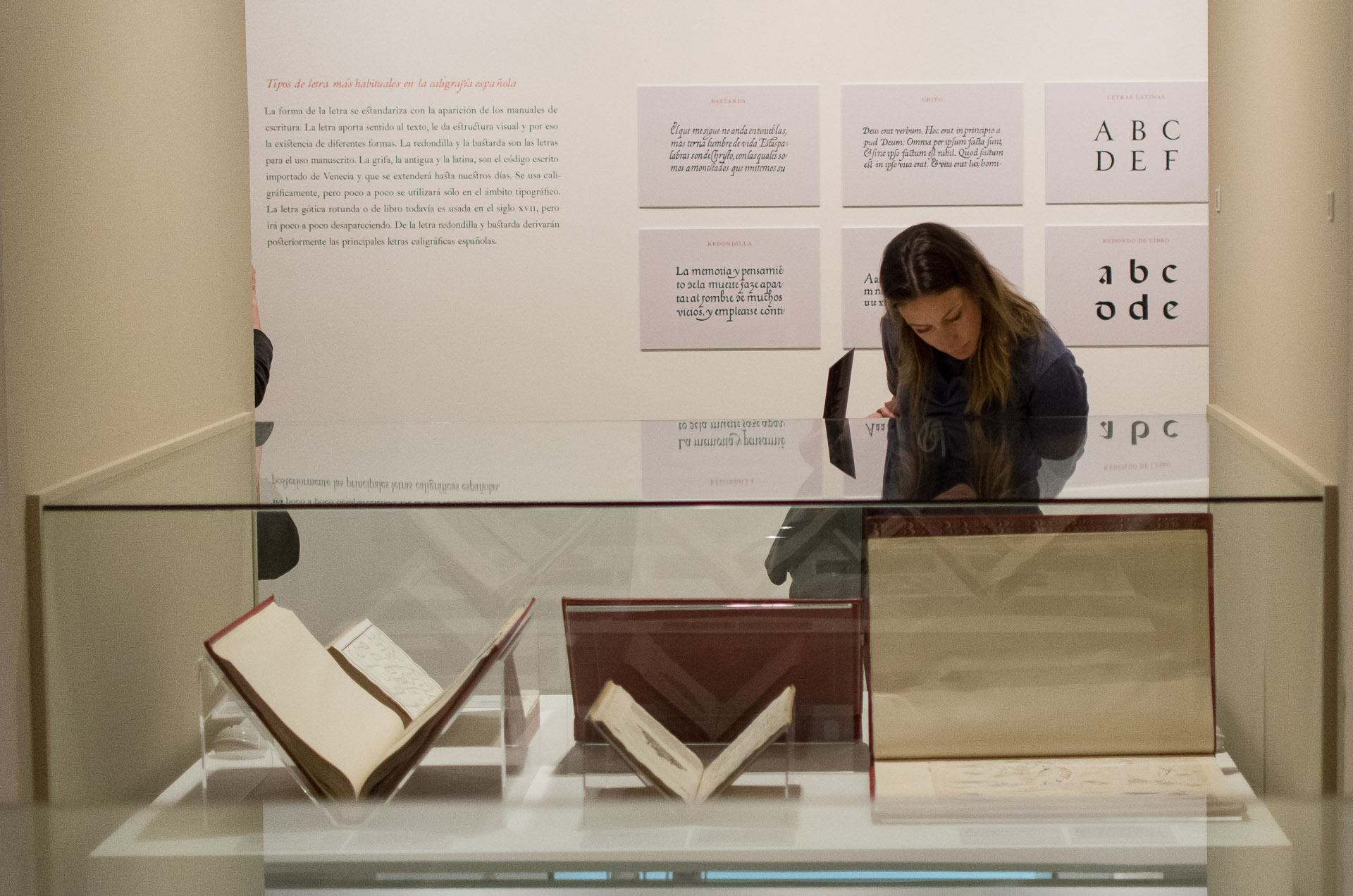 Una mujer observa varias láminas con letras fundidas y muestras de diferentes caligrafías.