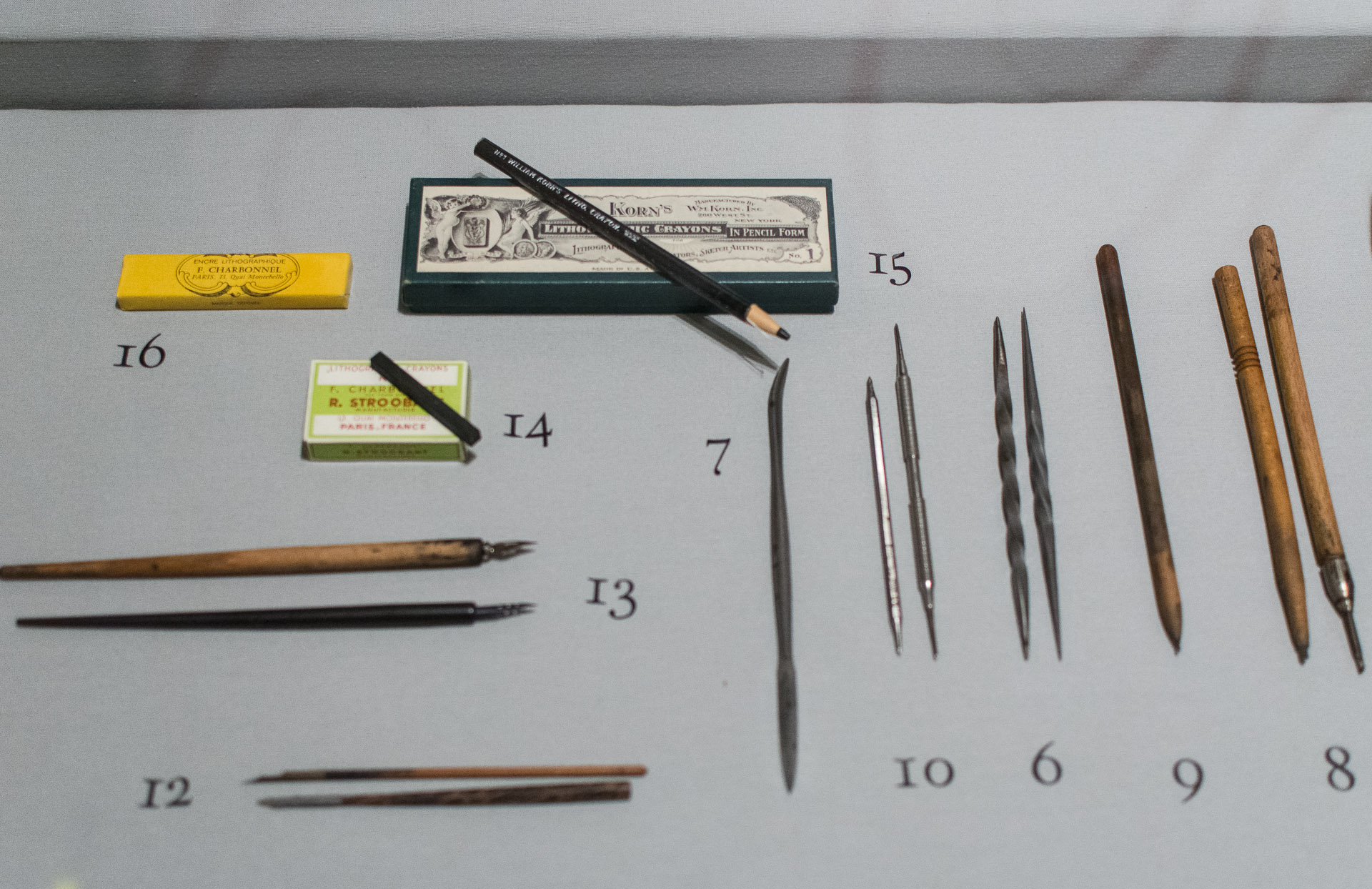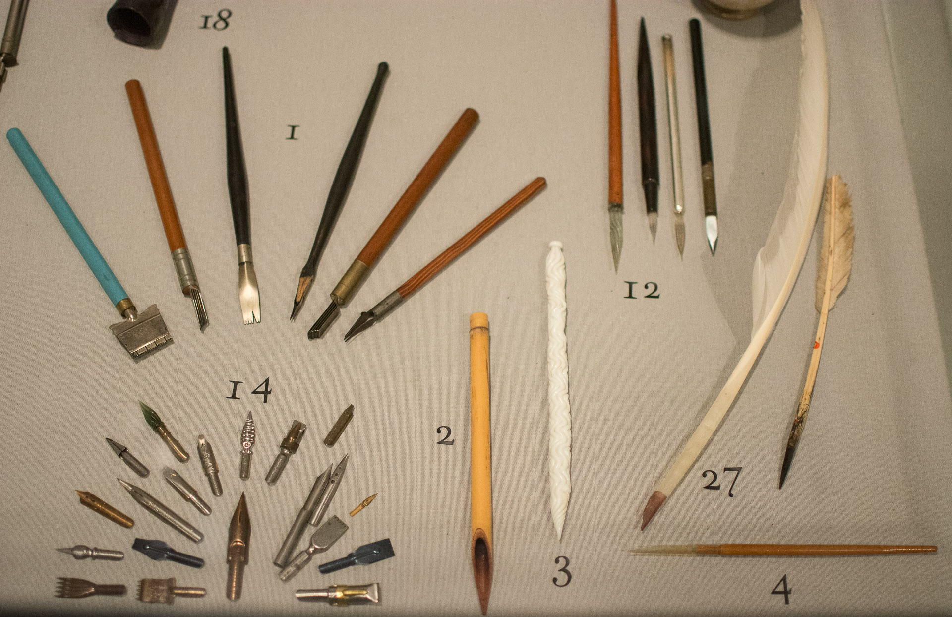 Varios útiles de caligrafía expuestos en la Biblioteca Nacional.