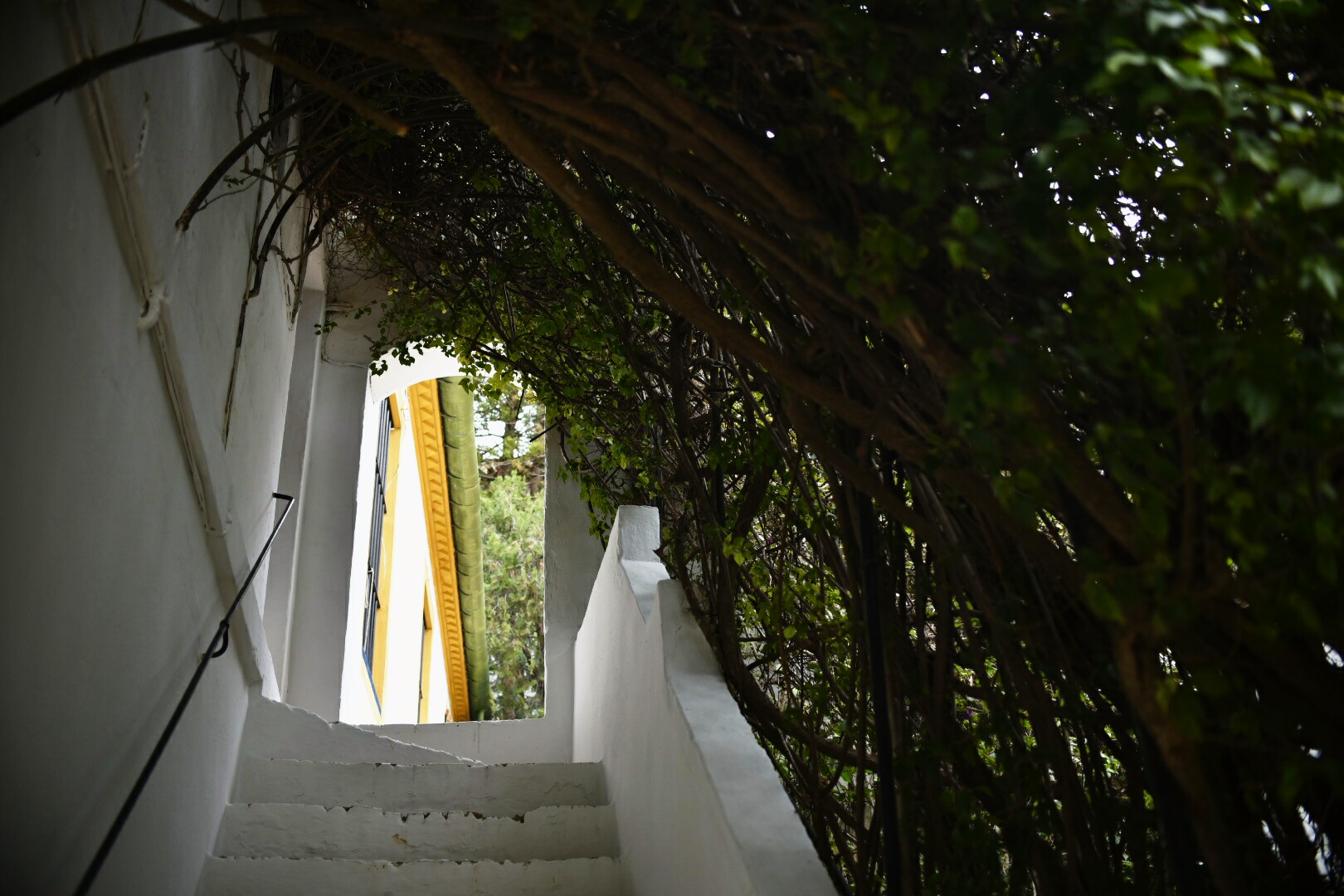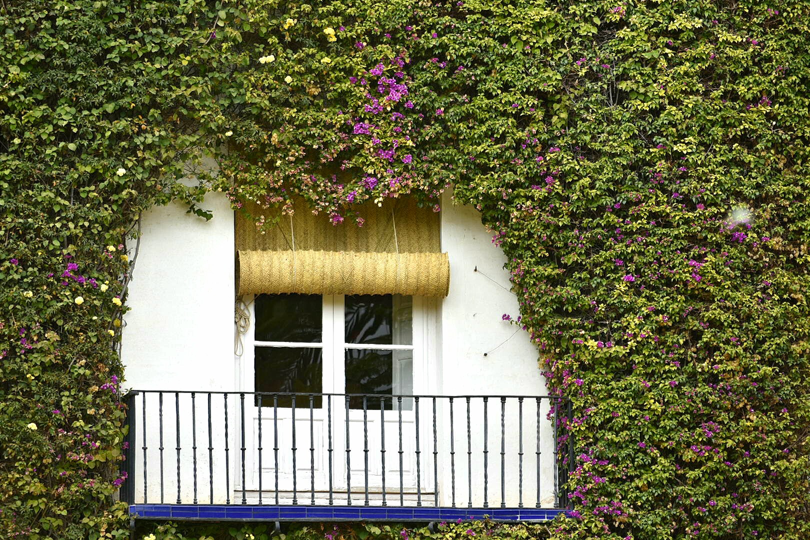 La frondosa vegetación muy florida se funde con las paredes blancas y amarillas de la casa, un detalle muy agradable.