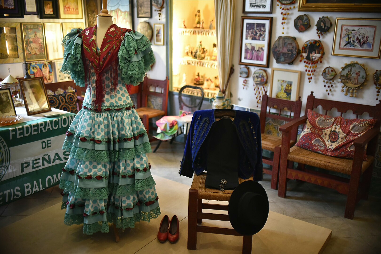 Un traje de sevillana y unos zapatos rojos, pertenecientes a la Duquesa de Alba.