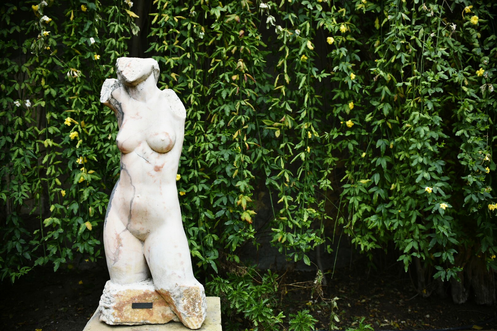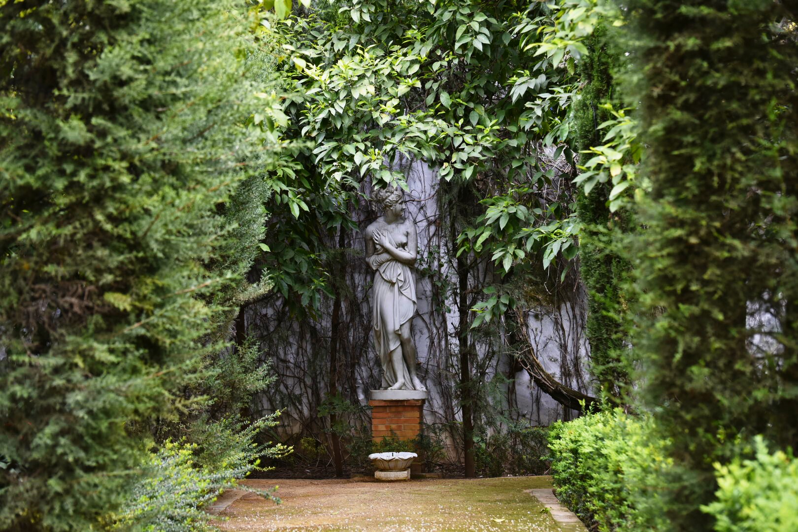 Una escultura romana vigila el final del jardín de los limoneros.