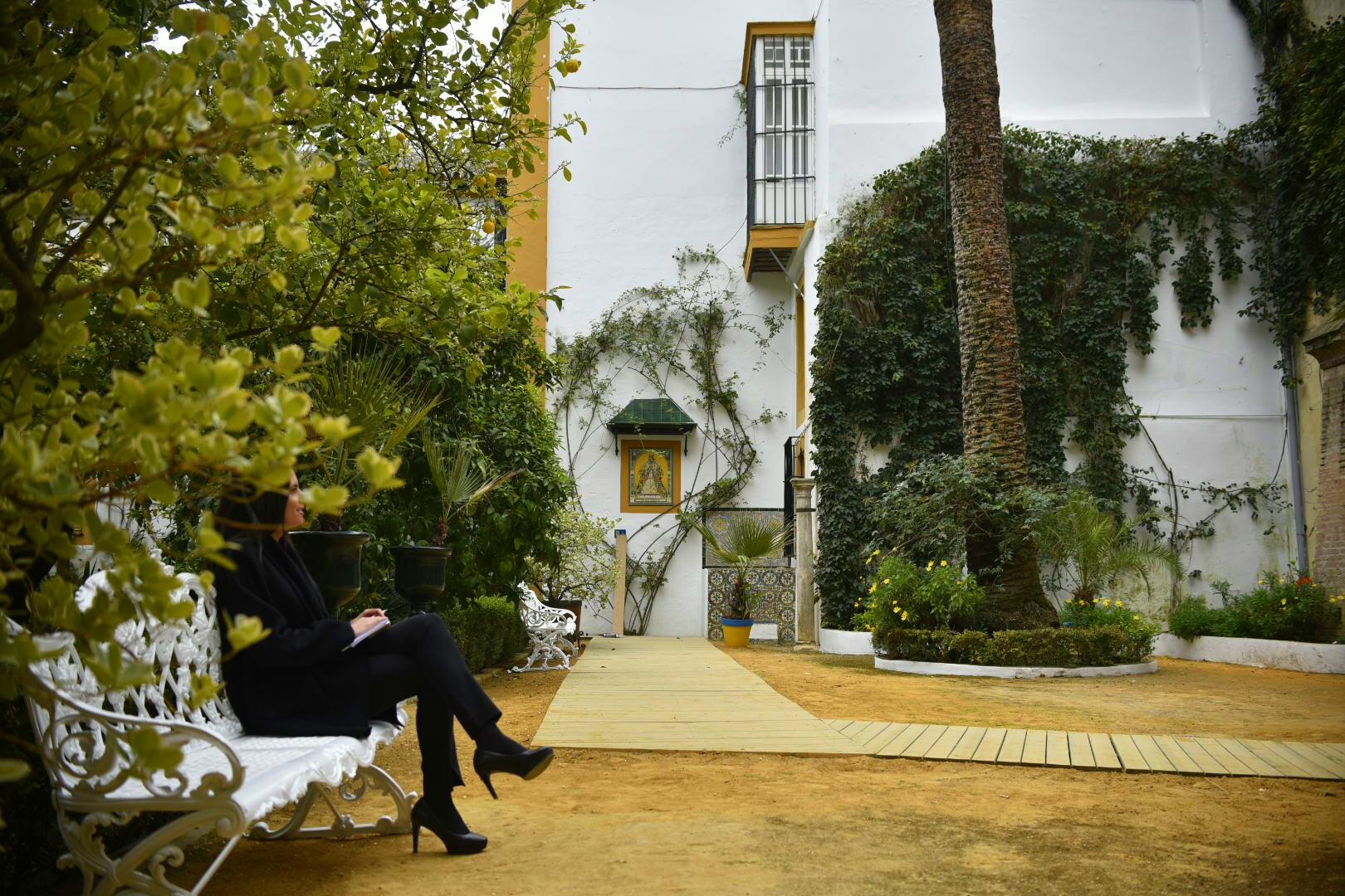 Una mujer descansa en uno de los bancos del jardín de los limoneros.