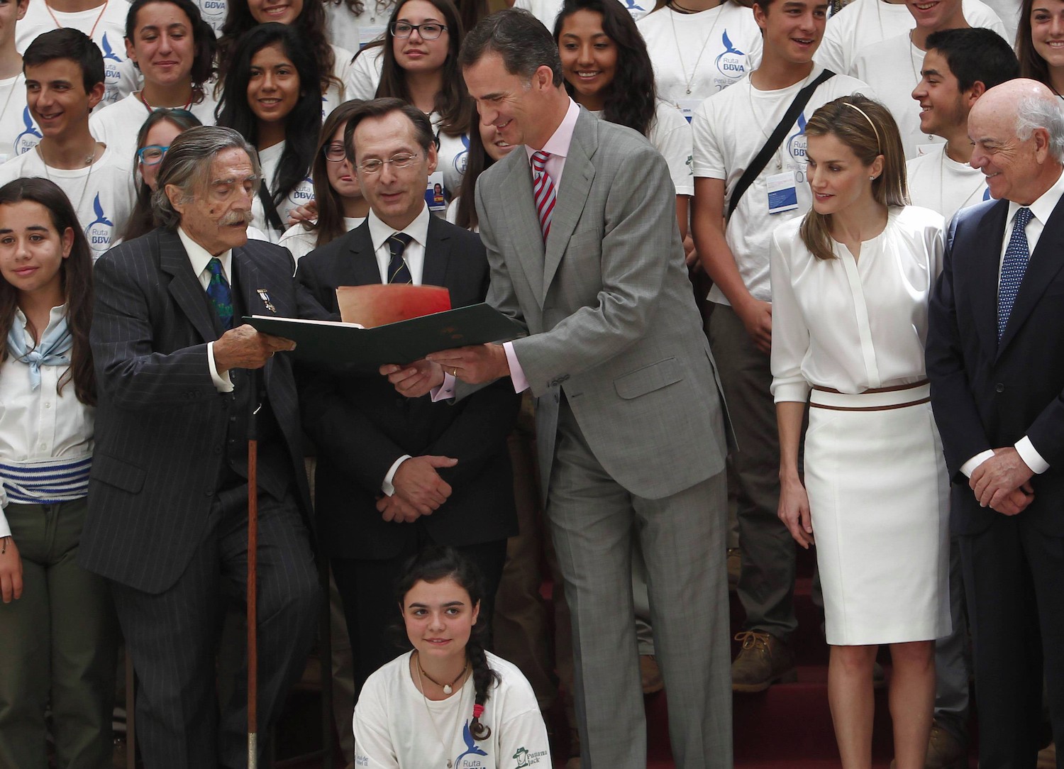 En 2009, el Gobierno de Navarra le concedió la medalla de la Cruz de Carlos III El Noble de Navarra. En la imagen, en un encuentro con los Reyes y los jóvenes que participaron en la edición 2014 de la Ruta Quetzal