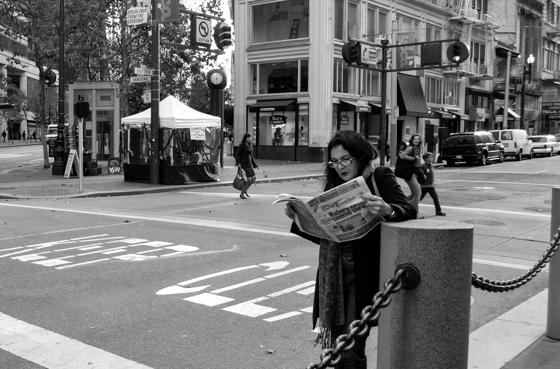 Una mujer lee el periódico del día entre las calles Sutter Street y Sansome Street cerca del distrito financiero.