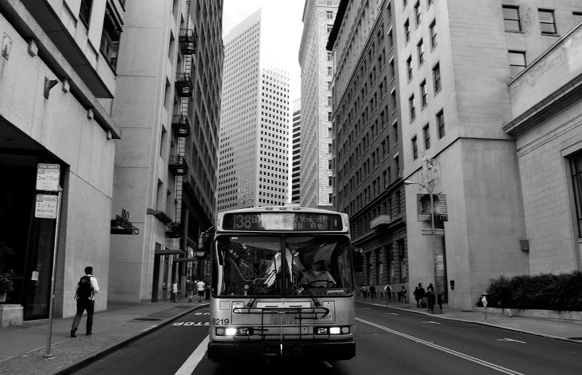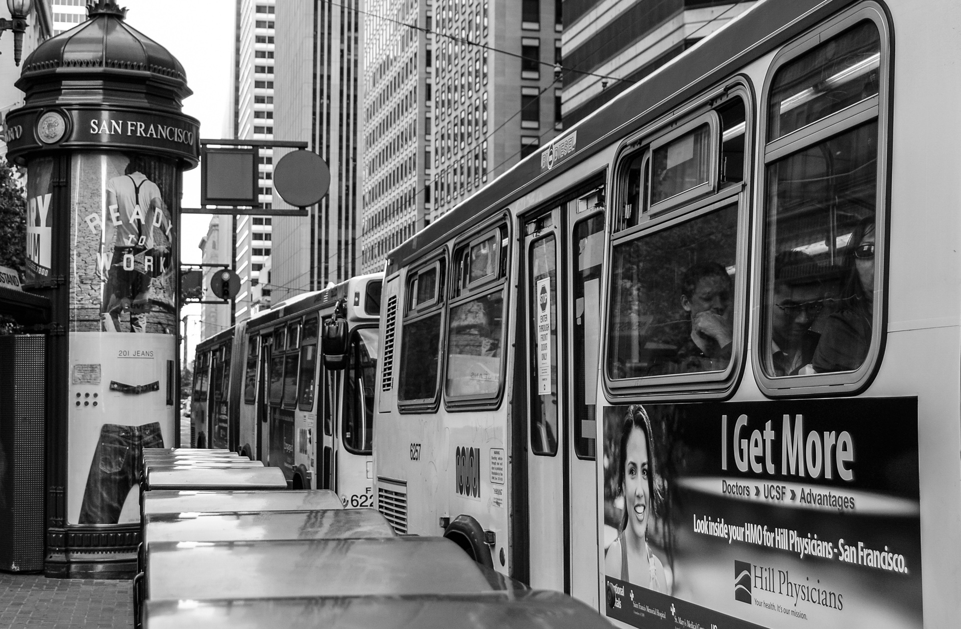 Varios autobuses realizan su ruta por las calles del centro de San Francisco.