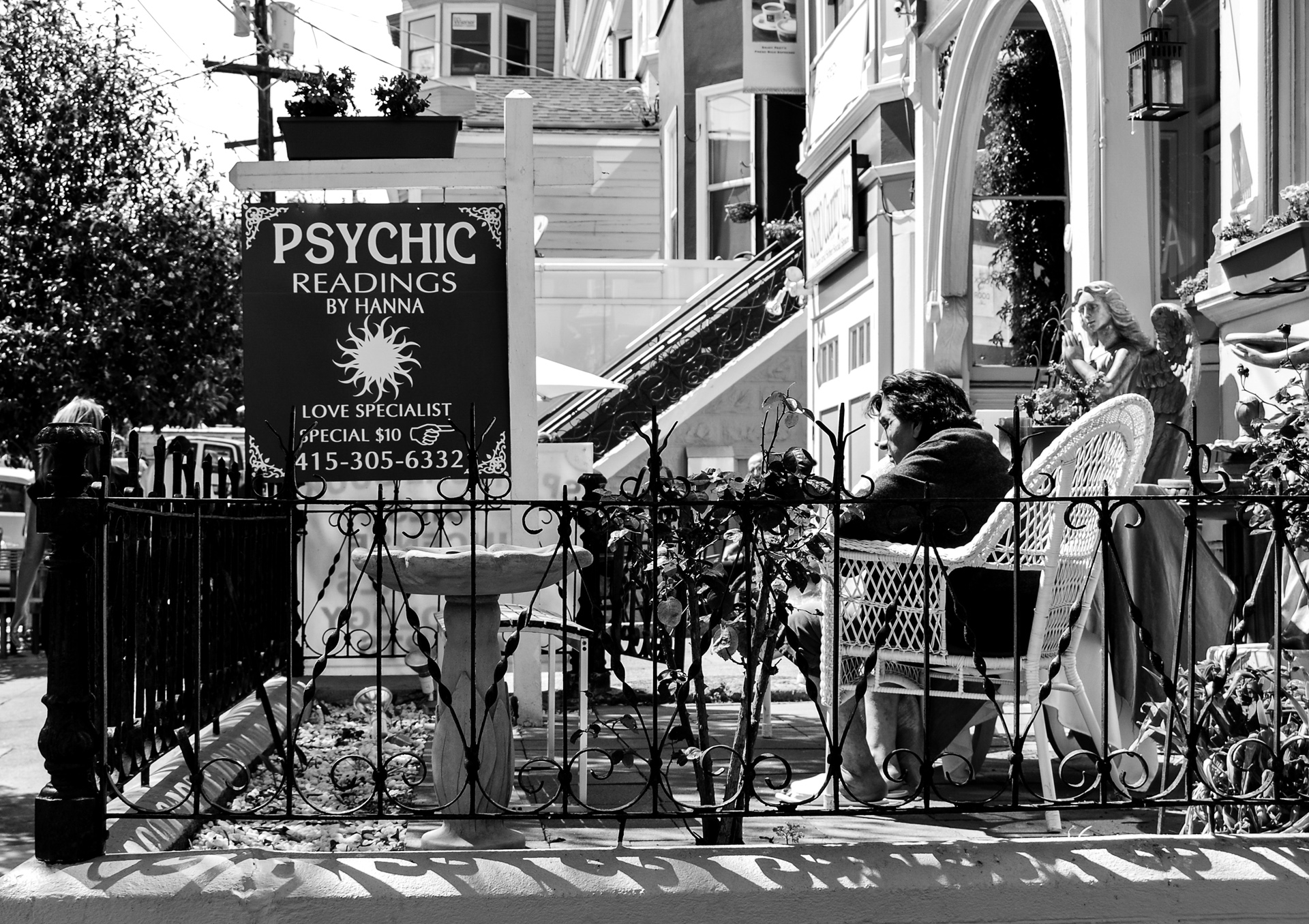 Una mujer ofrece sus servicios esotéricos sentada en la terraza de su casa. Una estampa que no desentona con la zona del barrio bohemio.