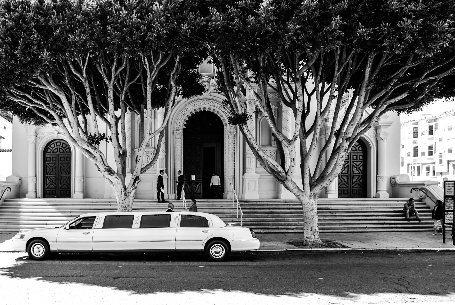 Una limusina y varios hombres esperan en la puerta de Misión Dolores.