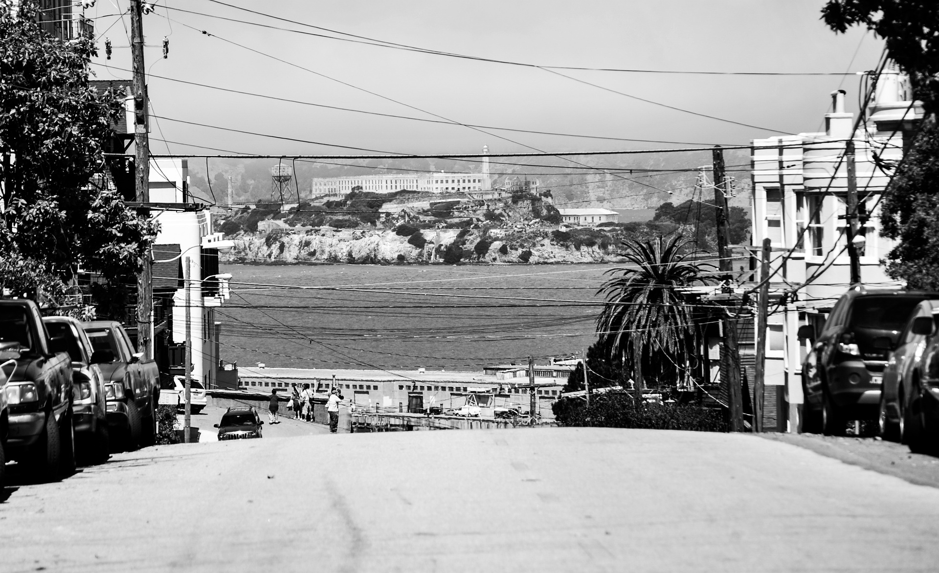 Subiendo hacia lo alto de San Francisco y si el día lo permite, se puede ver en el centro de la bahía el islote donde se encuentra la legendaria cárcel de Alcatraz.