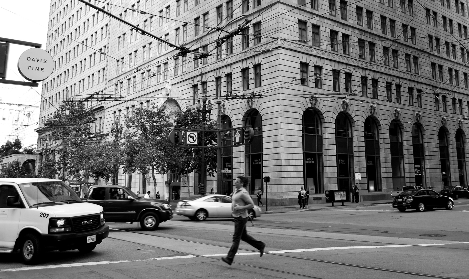 Un peaton corre para atravesar una de las calles del downton en San Francisco, entre Davis Street y Pine Street.