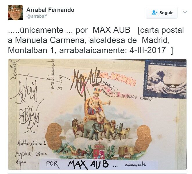 Fernando Arrabal ha colgado en Twitter una postal antigua con una imagen que puede recordar a La Cibeles en la que ha escrito "Manuela Carmena. Alcaldesa" y la dirección del Ayuntamiento de Madrid. "Max Aub del mundo merecía su presencia en su amado Madrid", ha dibujado Arrabal alrededor de la imagen de la postal, en la que ha añadido: "Por Max Aub... únicamente".