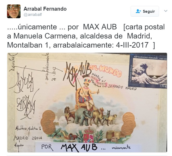 .....únicamente ... por MAX AUB [carta postal a Manuela Carmena, alcaldesa de Madrid, Montalban 1, arrabalaicamente: 4-III-2017 ] pic.twitter.com/Mgvsg1p8T8