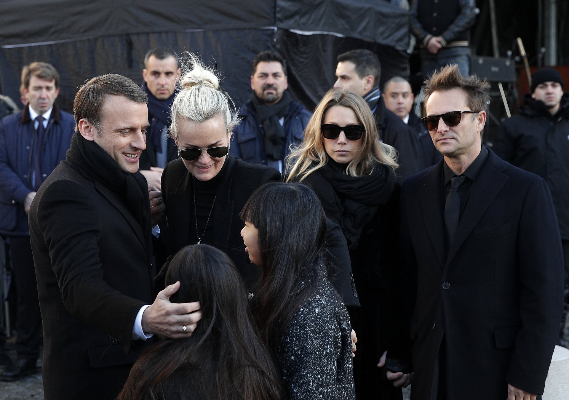 El presidente francés, Emmanuel Macron, saluda a la viuda, Laetitia Hallyday, y a los hijos del cantante (Joy Hallyday, Jade Hallyday, Laura Smet, David Hallyday).
