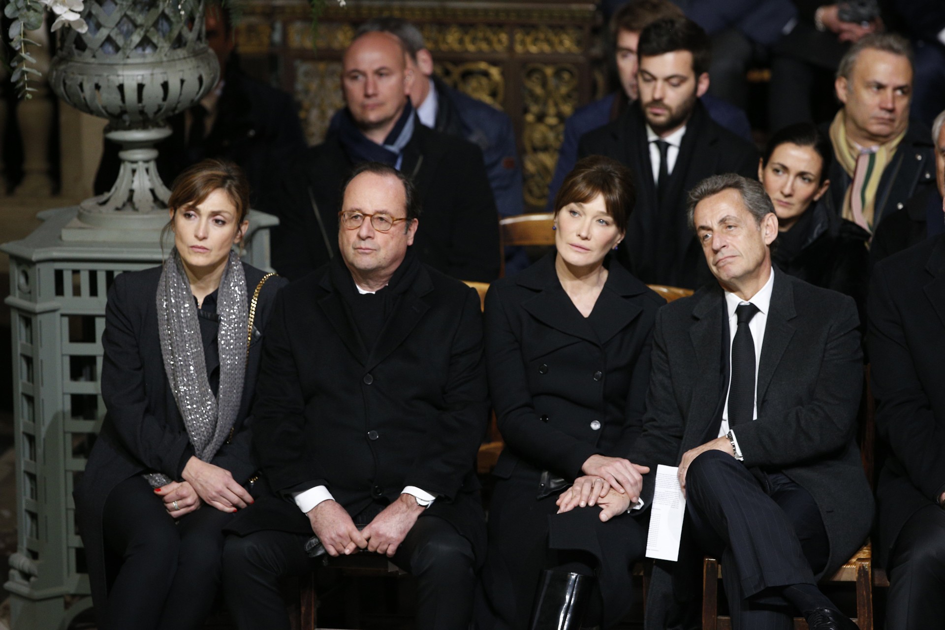 Los ex presidentes franceses Nicolas Sarkozy y Francois Hollande, Carla Bruni Sarkozy y Julie Gayet asisten al servicio fúnebre del rockero francés Johnny Hallyday en la iglesia de La Madeleine en París.