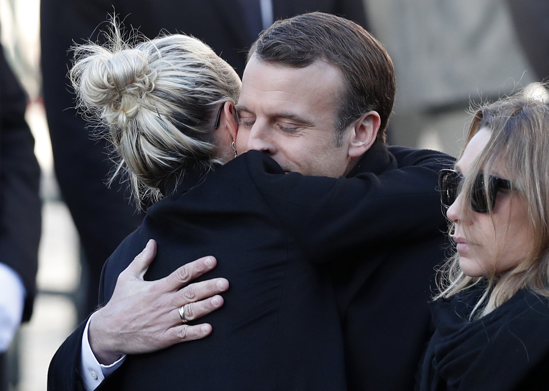 El presidente francés, Emmanuel Macron, da sus condolencias a la viuda del rockero, Laetitia Hallyday.