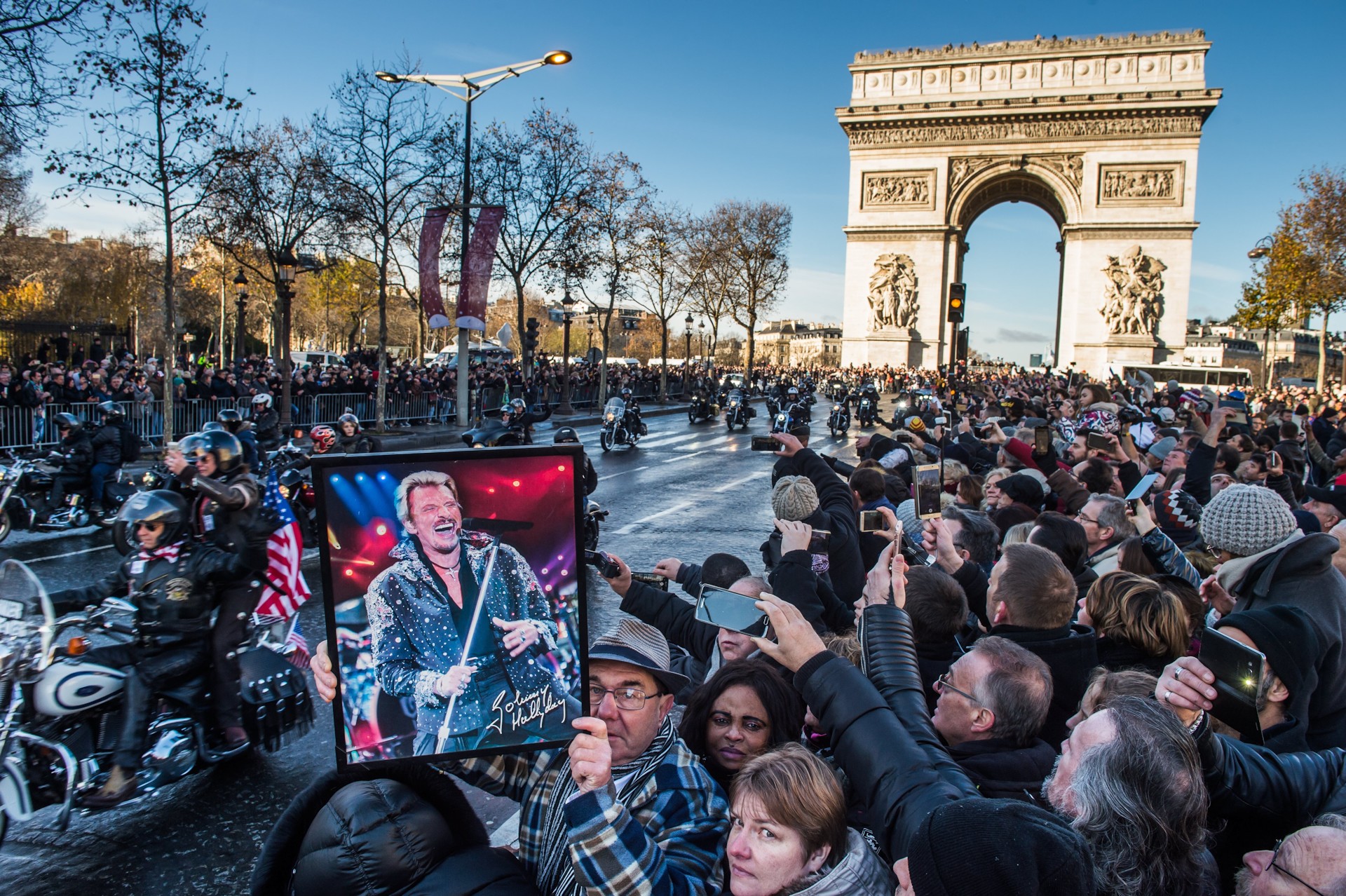 Los franceses dedican un homenaje multitudinario al rockero Johnny Hallyday, una figura mítica en el país que va más allá de su trascendencia musical.