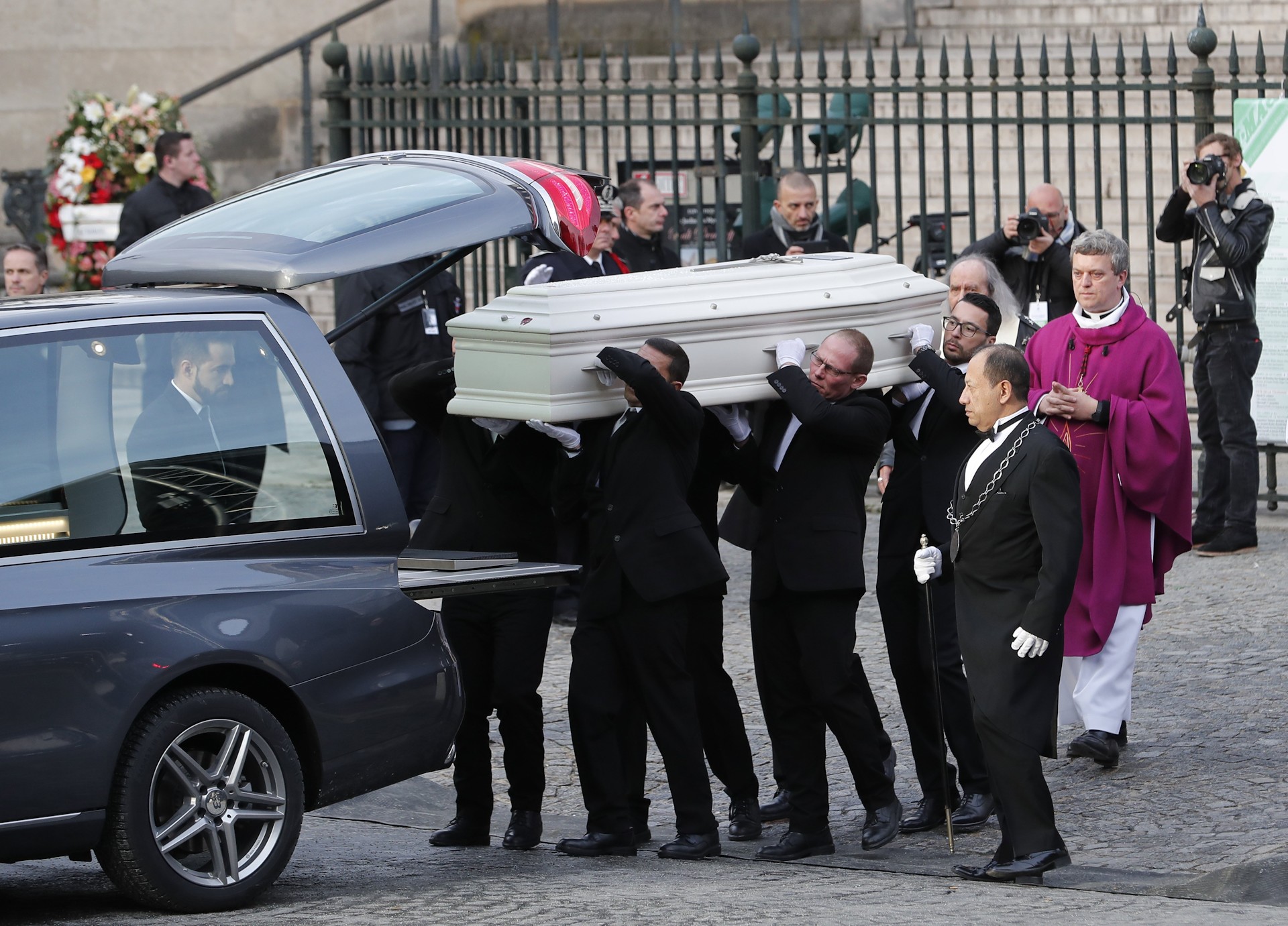Los portadores del féretro en el exterior de la iglesia de La Madeleine tras la ceremonia fúnebre.