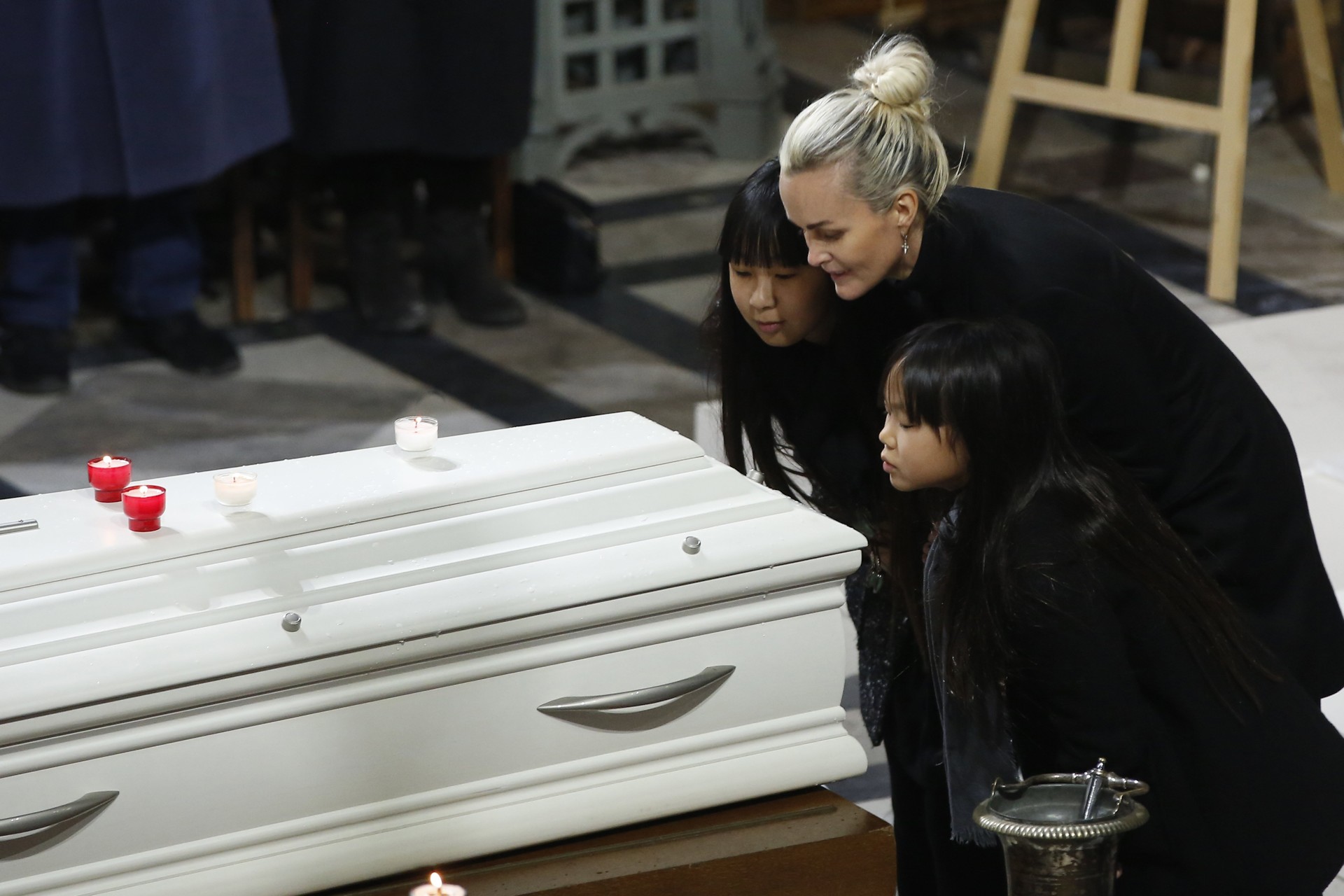 Laeticia Hallyday y sus hijos (Jade y Joy) besan el ataúd durante el funeral.