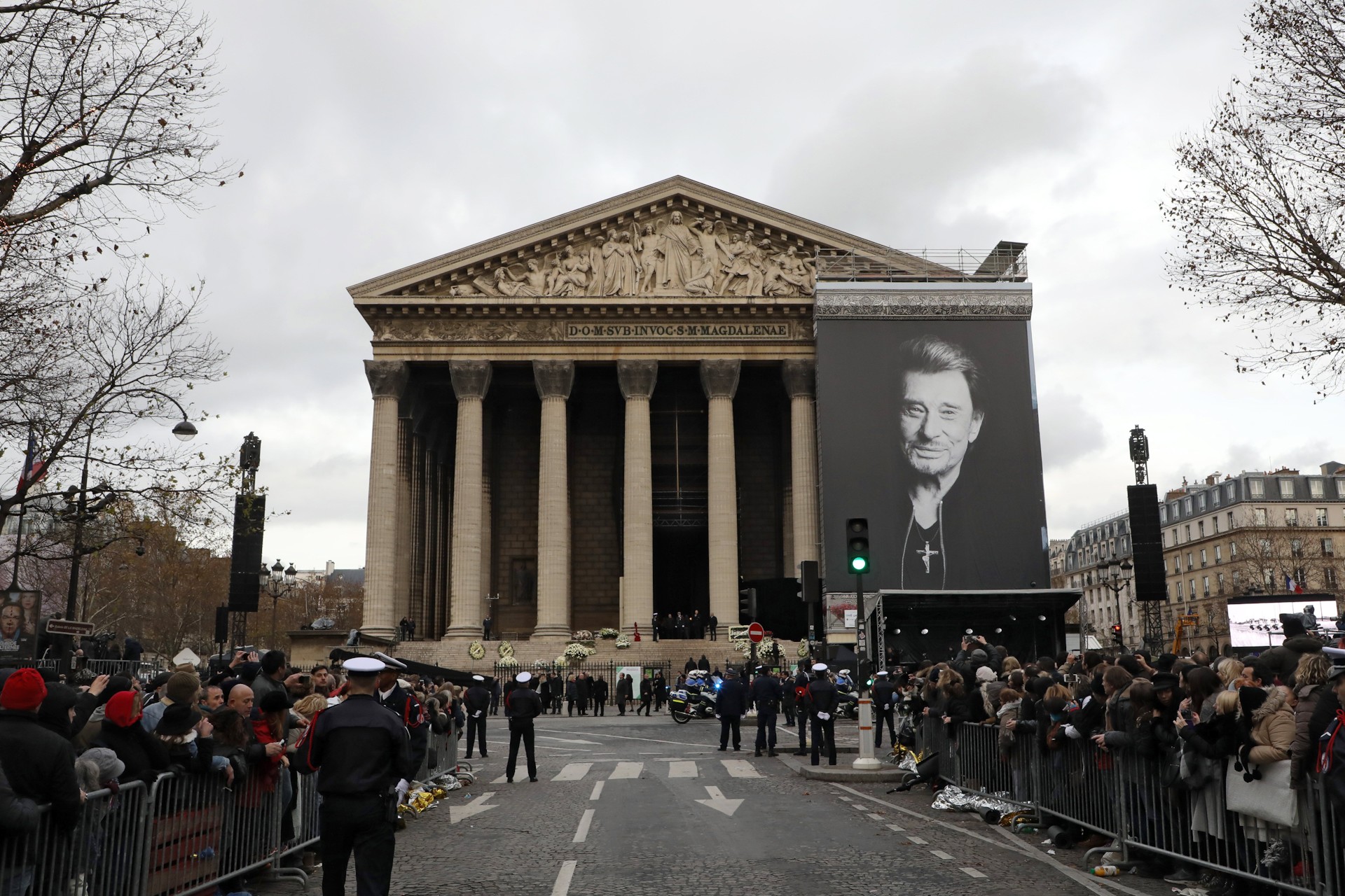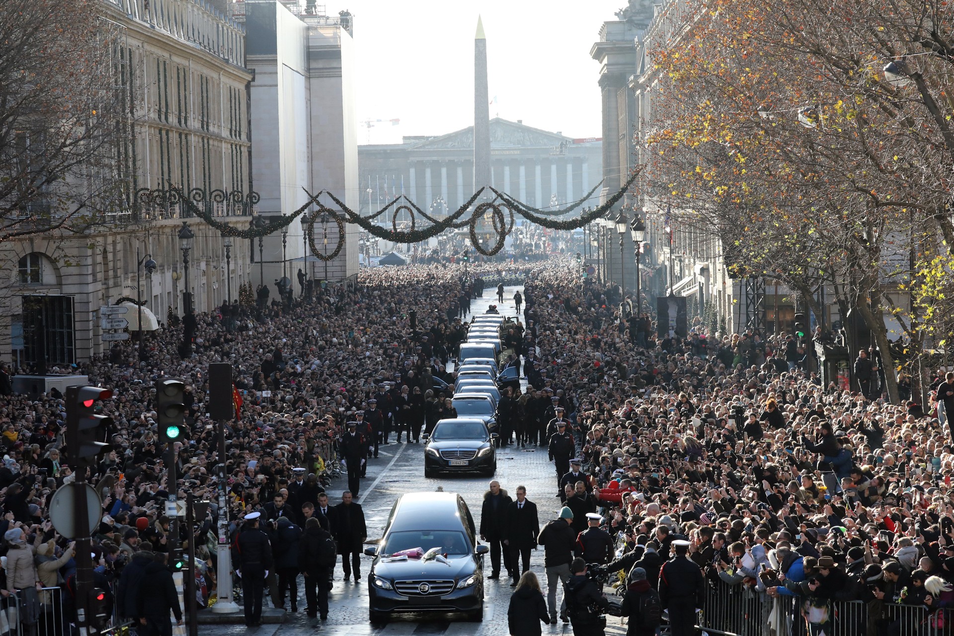 El cortejo fúnebre que transporta el ataúd del difunto cantante francés Johnny Hallyday llega a la Iglesia La Madeleine.