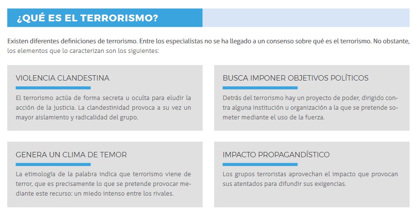 En el desarrollo sobre el terrorismo se mencionan los primeros atentados terroristas cometidos en nuestro país, como el de la pequeña Begoña Urroz o el del guardia civil José Pardines; las grandes masacres como los atentados contra la Casa Cuartel de Zaragoza, el centro comercial Hipercor en Barcelona o el 11-M en Madrid; además de otros que movilizaron a todo el país, como los de Miguel Ángel Blanco o el secuestro de José Antonio Ortega Lara.